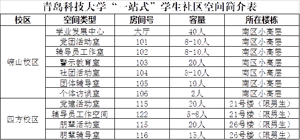 其中,新开发建设的崂山校区“一站式”学生社区服务中心位于崂山校区南区小高层,包含学业发展中心(可同时容纳30-40人,用于开展座谈交流、理论学习等活动)、党团活动室、辅导员工作室、警示教育室、社团活动室、团体辅导室、个体访谈室7个功能空间;四方校区“一站式”学生社区包含辅导员工作空间、党建活动室、朋辈活动室、朋辈辅导室4个功能空间,主要位于四方校区21#、26#学生宿舍楼。具体分布及简介如下。