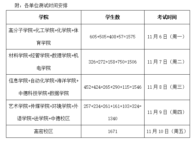 1.各学院、校区要严格按照《测试时间安排》组织新生测试,并以新生入学教育测试为契机,进一步巩固入学教育效果。