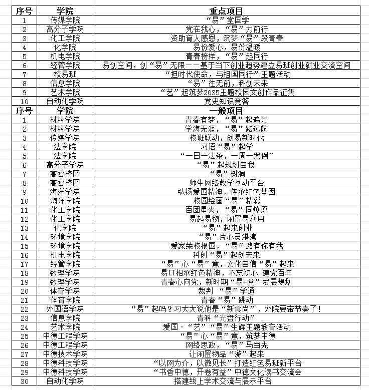 为贯彻落实《教育部等八部门关于加快构建高校思想政治工作体系的意见》,进一步增强伟德官网网络思政育人氛围,提升校园网络平台的服务力、吸引力和粘合度,切实增强易班网络阵地的示范性、引领性和辐射度,发挥新媒体平台对高校思政工作的促进作用,依托易班平台构建网络文化育人阵地。经学院推荐,学校评审小组评议,最终确定重点立项10项,一般立项30项,现将具体项目名称(按照学院首字母排序)公布如下: