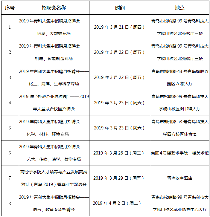 为全面学习贯彻落实习近平新时代中国特色社会主义思想和党的十九大精神,贯彻落实国家、山东省、青岛市关于促进高校毕业生就业创业的决策部署,创新实施大学生就业创业促进计划,促进毕业生更多渠道更高质量更加充分就业创业,学校将于2019年3月-4月启动“青科大集中招聘月”活动,诚挚邀请各用人单位到校招聘,企业报名方式详见招聘会链接;欢迎广大毕业生积极参加。现将招聘月期间各场招聘会通知发布如下: