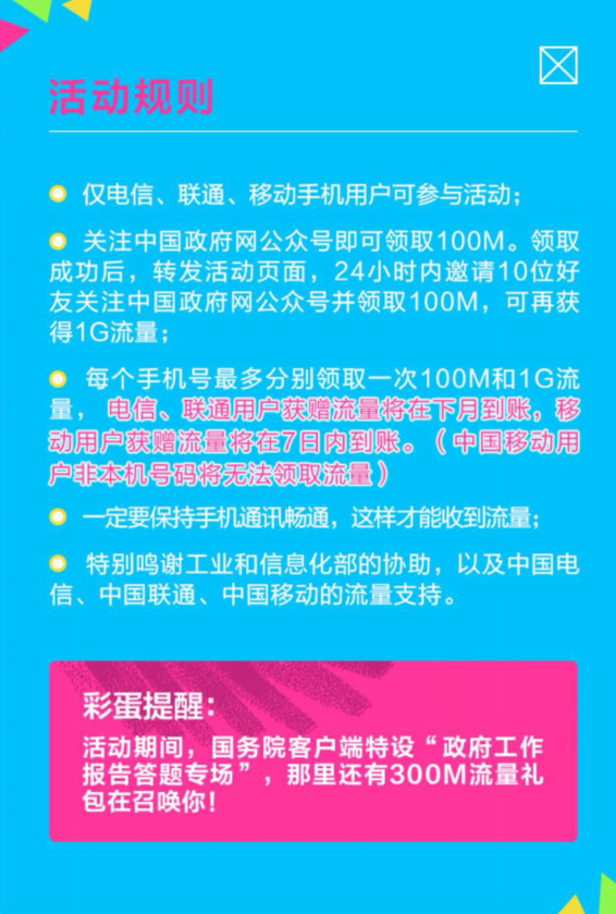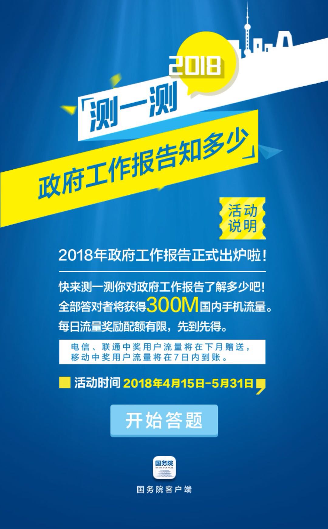 为学习贯彻2018政府工作报告,帮助大学生更好的了解和掌握中央、国务院大政方针,关注国家大事,了解民生信息,伟德官网特组织学生参与“测一测,2018政府工作报告知多少”在线学习答题活动。各学院可通过形式多样的活动宣传,组织学生下载国务院客户端、关注“中国政府网”微信公众号。参与客户端学习“2018政府工作报告解读”专题,并答对10道题即可获赠300M手机流量;关注微信公众号即可获赠100M流量,邀请10位好友关注可获赠1G流量。