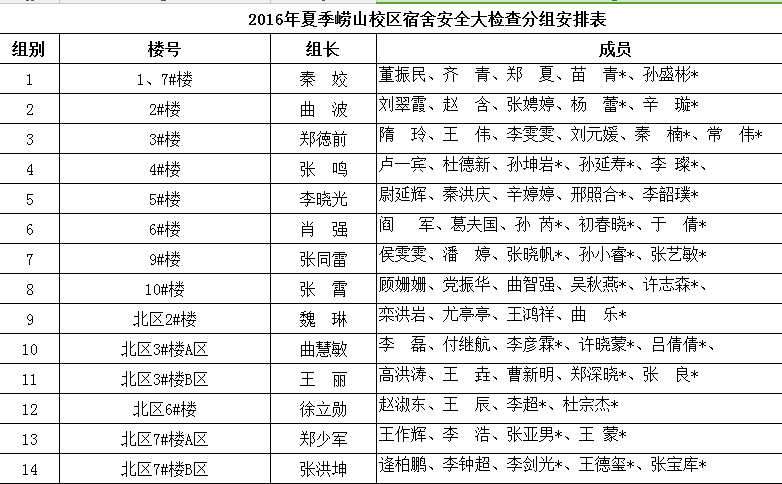 4、请崂山校区、四方校区、高密校区所有检查人员于6月2日上午8:50分别在弘毅广场、小五四广场(第二实验楼前)、六号楼前集合9:00正式开始检查。