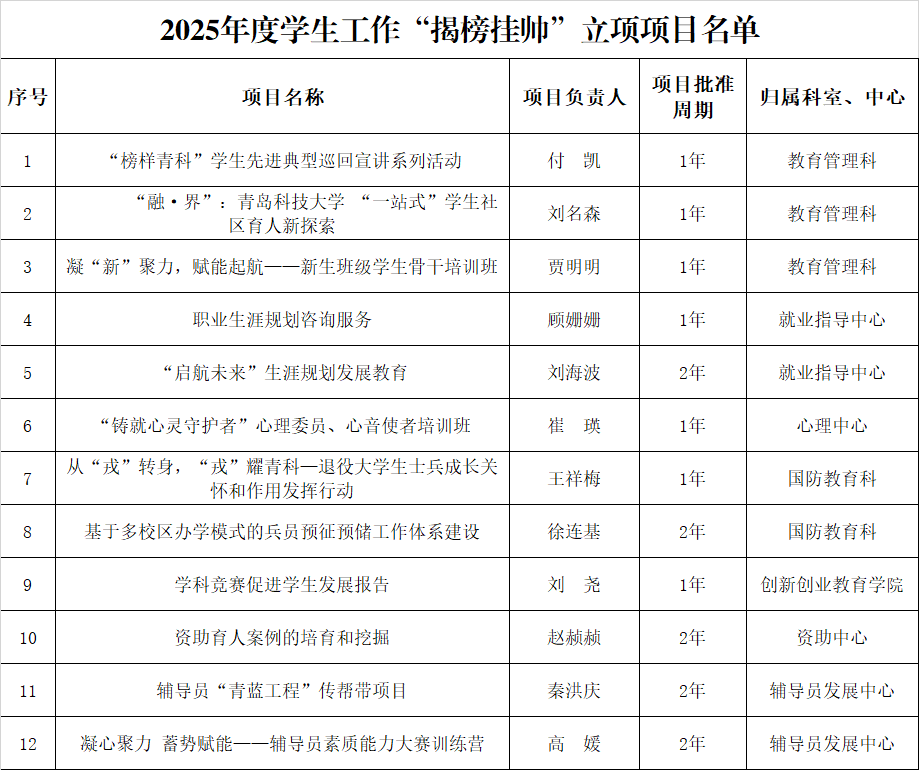 为加强辅导员队伍建设,提升学生工作质效,根据《关于发布2025年度学生工作“揭榜挂帅”项目的通知》,经团队(个人)申报、专家组评审,确立12个项目为2025年度学生工作“揭榜挂帅”立项项目,现予以公布,并就有关事项通知如下: