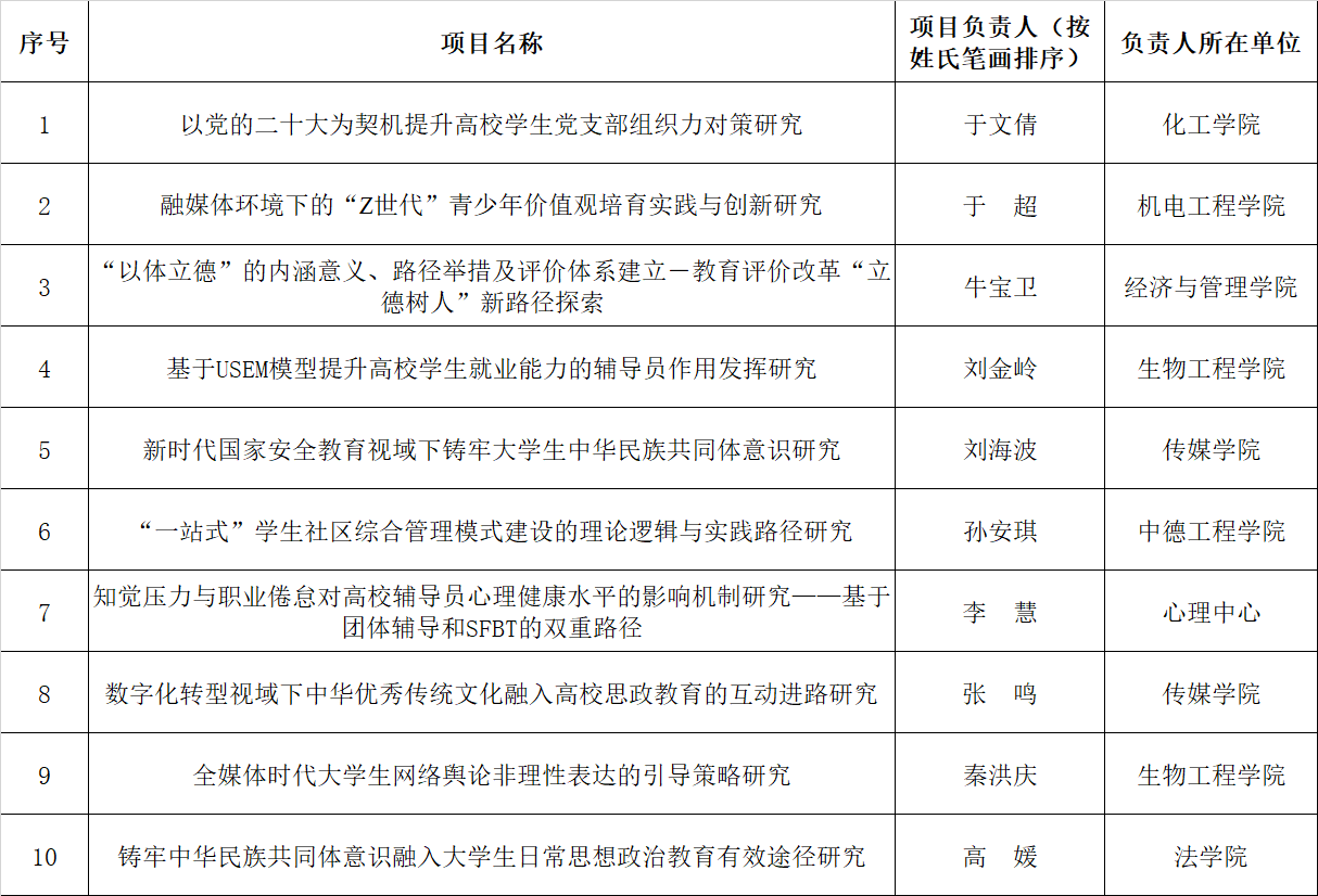根据《关于开展2024年度伟德国际1949官网社科基金项目(辅导员研究专项)申报工作的通知》相关要求,经过专家评审、学校审议,拟确立10个项目为2024年度伟德国际1949官网社科基金项目(辅导员研究专项)立项项目,现予以公示(按项目负责人姓氏笔画排序),公示期为12月18日至12月25日。