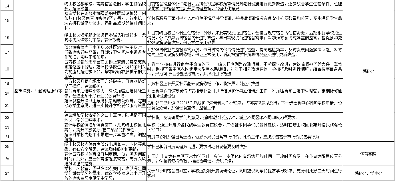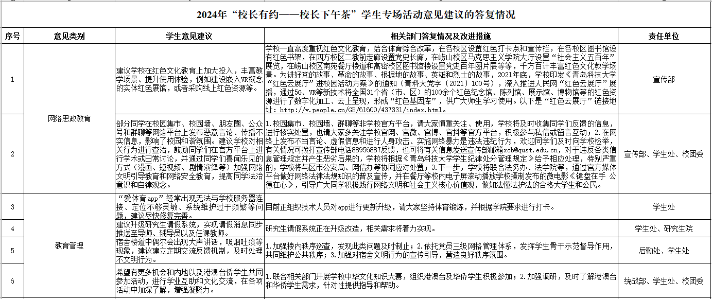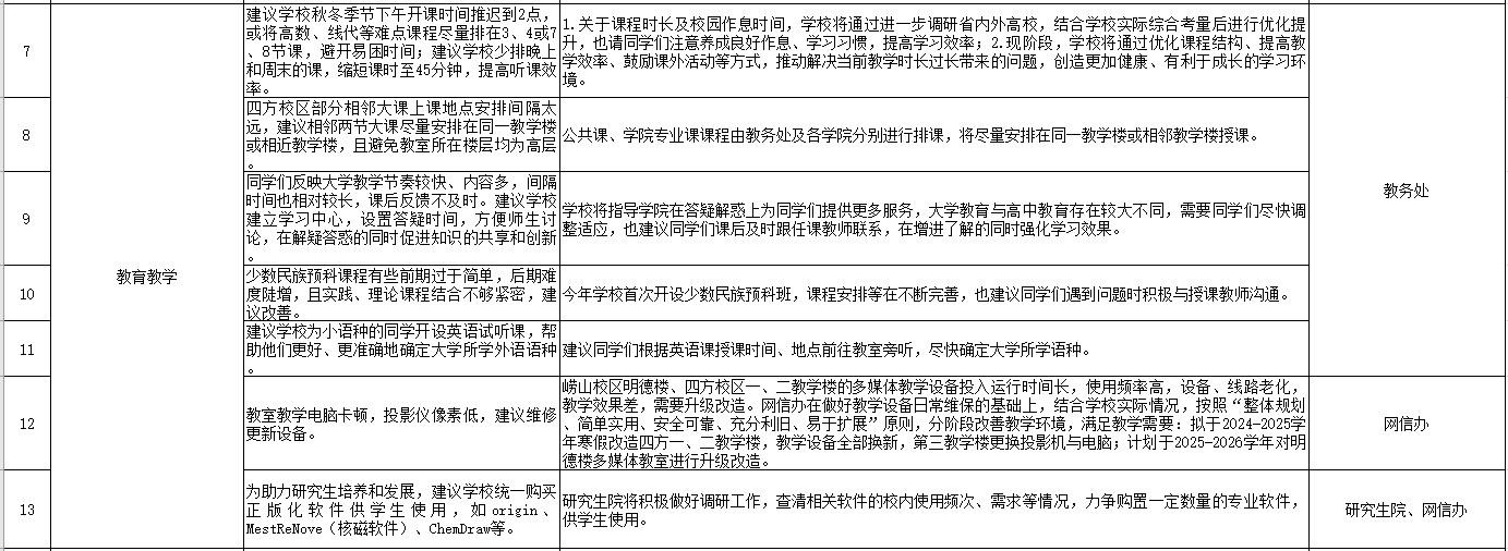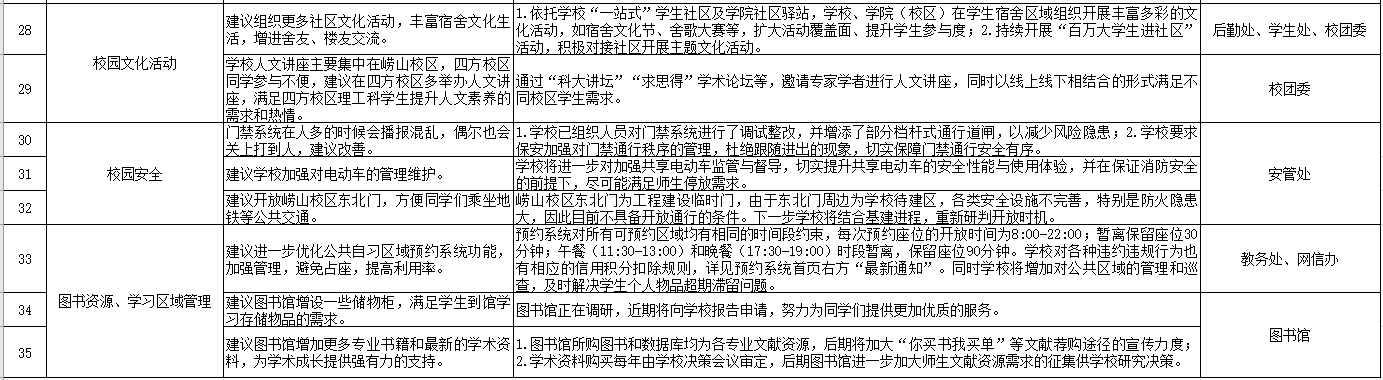 相关部门负责人认真记录并对部分问题进行现场解答。会后,党委学生工作部(处)会同相关部门多次调度、深入研讨,对学生代表提出的意见建议进行了处理和答复,并总结梳理形成7类35项意见建议及答复的工作清单,具体情况如下: