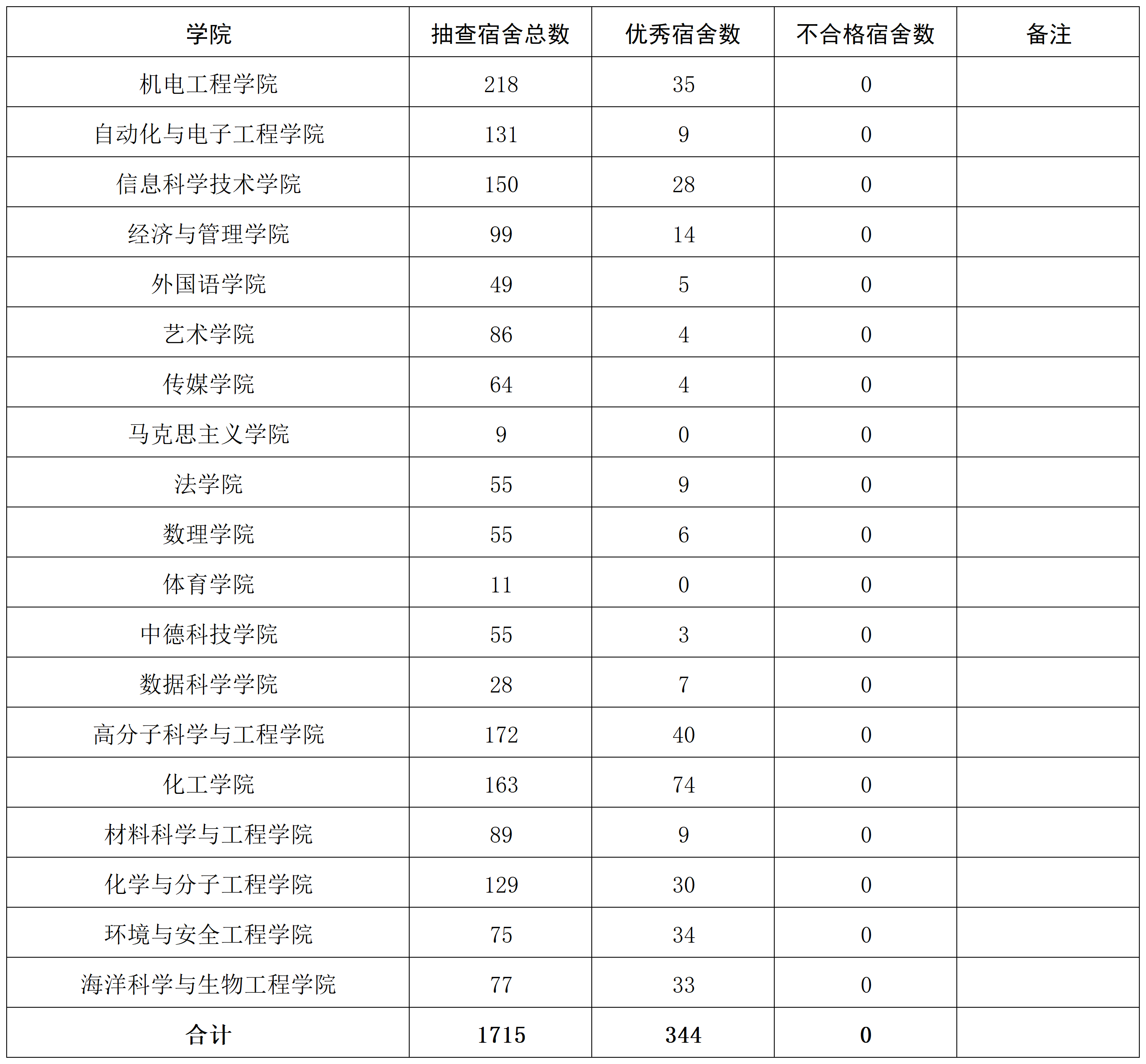 为进一步加强学生宿舍内务卫生和安全文明创建,强化学生宿舍安全意识,营造一个安全舒适、整洁优雅、文明和谐的宿舍环境126日,学生工作处、保卫处、后勤管理处及各学院开展了学生宿舍卫生安全秩序大检查。本次共抽查宿舍1715间,经统计,优秀宿舍344间,合格宿舍1371间,不合格宿舍0间。