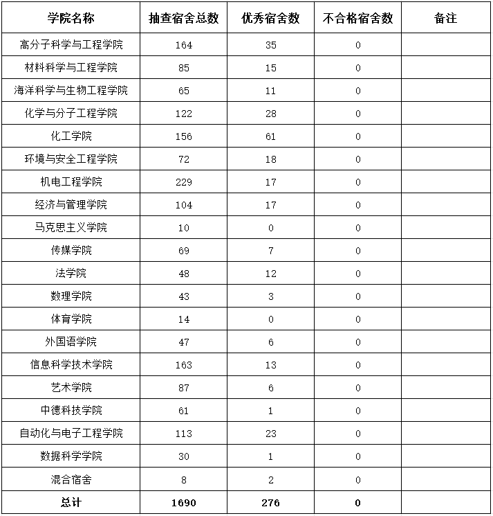为进一步加强学生宿舍内务卫生和安全文明创建,强化学生宿舍安全意识,营造一个安全舒适、整洁优雅、文明和谐的宿舍环境,10月25日,学生工作处、保卫处、后勤管理处及各学院开展了学生宿舍卫生安全秩序大检查。本次共抽查宿舍1690间,经统计,优秀宿舍276间,合格宿舍1414间,不合格宿舍0