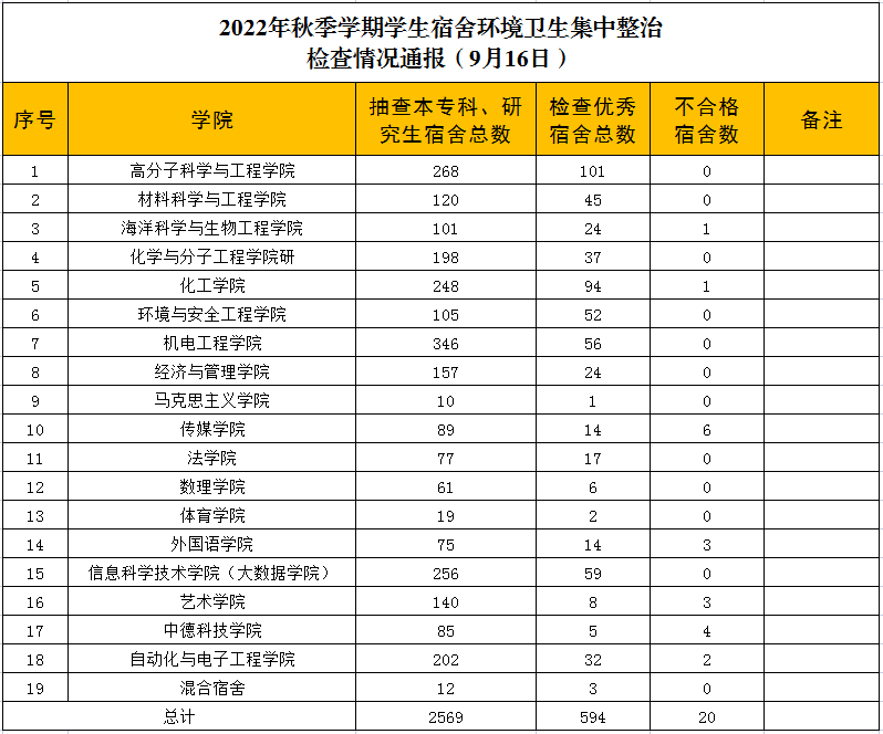 为创建干净、整洁、有序的宿舍卫生环境,进一步加强学生宿舍卫生管理,提升学生综合素养9月16日,学生处、研究生院、后勤处及各学院开展了学生宿舍环境卫生集中整治检查。本次共抽查宿舍2569间,经统计,优秀宿舍594间,合格宿舍1955间,不合格宿舍20间,不合格宿舍主要表现为人走未断电、插排未拔、被褥未叠等现象。