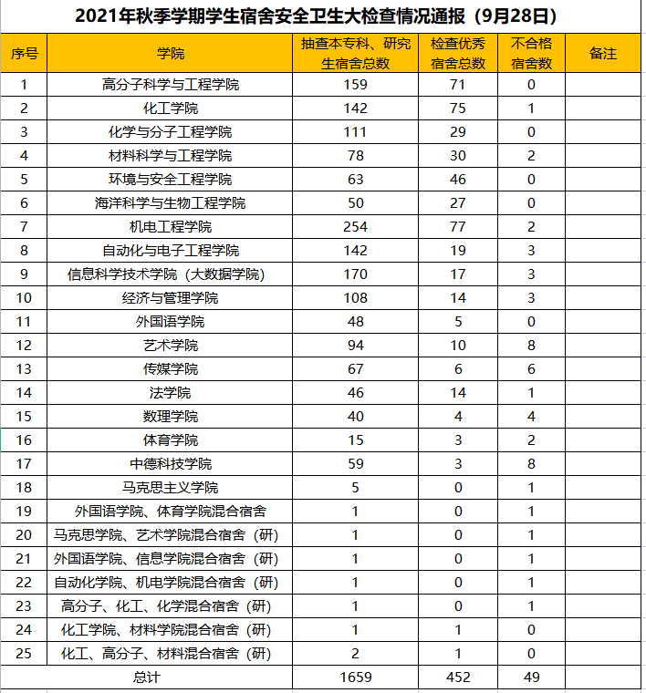 鉴于各检查组评选优秀等级的标准不完全统一,经研究决定,本次检查各学院宿舍优秀率不计入年底工作考核。同时,将各学院不合格宿舍情况公示如下,请各学院对照问题抓好不合格宿舍的整改,并将相关宿舍整改情况10月5日(周二)上午11点前,以学院为单位四方校区报送至邮箱:sfgyzx2013@163.com,崂山校区报送至邮箱:1281669817@qq.com。