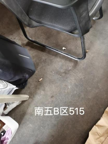 1、南5舍B515宿舍有烟头,卫生未打扫。