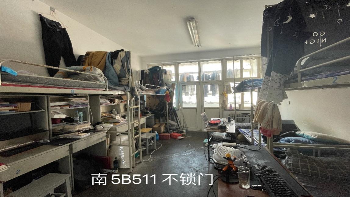 3、南5舍B511宿舍未叠被、人走未锁门、堆放杂物。
