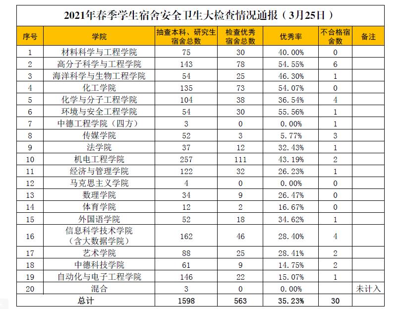 3月25日,学生处、研究生院、保卫处、后勤处及各学院组织开展了学生宿舍卫生安全秩序大检查,本次共抽查宿舍1598间,经各检查组验收评定,共评选出优秀宿舍563间,整体优秀率35.23%;合格宿舍1005间,不合格宿舍30间,其中不合格宿舍大多表现为人走未断电、插排未拔、卫生不合格、被褥未叠等现象。现将各学院检查情况通报如下: