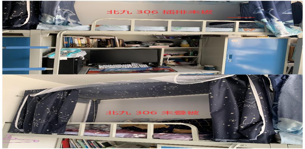 1、北9舍306宿舍被子未叠,插座未拔(艺术学院)。