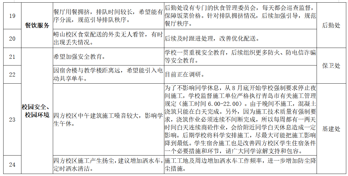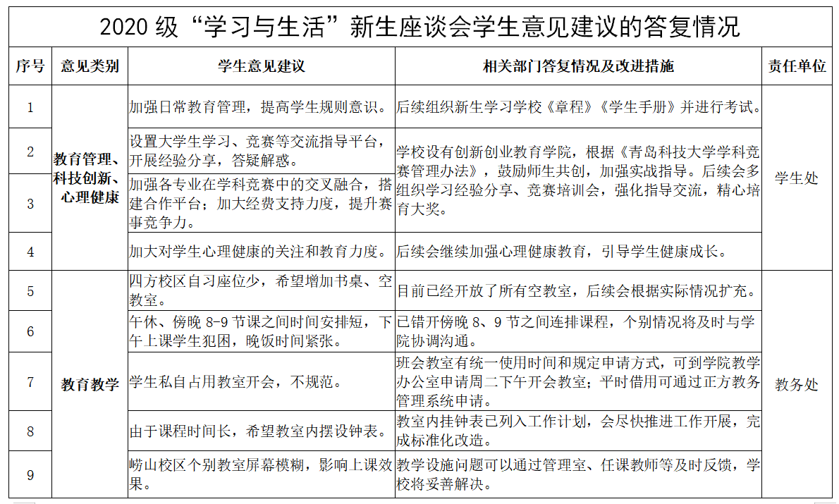 2020年10月8日,学校召开2020级“学习与生活”新生代表座谈会,党委常委、副校长丁林出席会议并讲话,学生处、教务处、保卫处、后勤处、校团委等相关部门负责人及各学院34名新生代表参加会议。会上,新生代表以积极的态度从学生教育管理、教学安排、校园安全和后勤服务保障等方面提出了79条意见建议,相关部门负责人认真记录并对部分问题作现场解答。会后,党委学生工作部(处)对新生代表提出的意见建议和相关部门答复情况进行总结梳理,形成6类24项学生意见建议清单,并多次进行调度,各相关部门根据清单内容积极研究措施,协调解决落实,有关答复情况如下:
