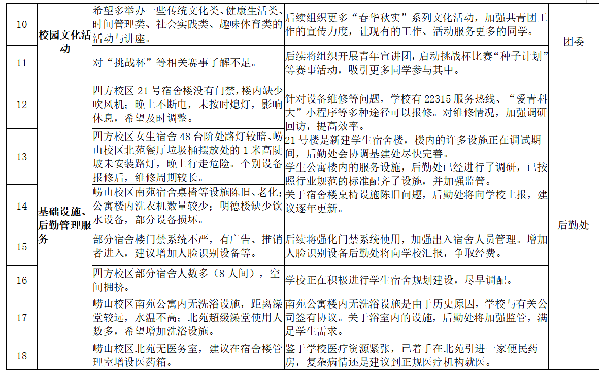 关于对“学习与生活”新生代表座谈会上学生意见建议的答复