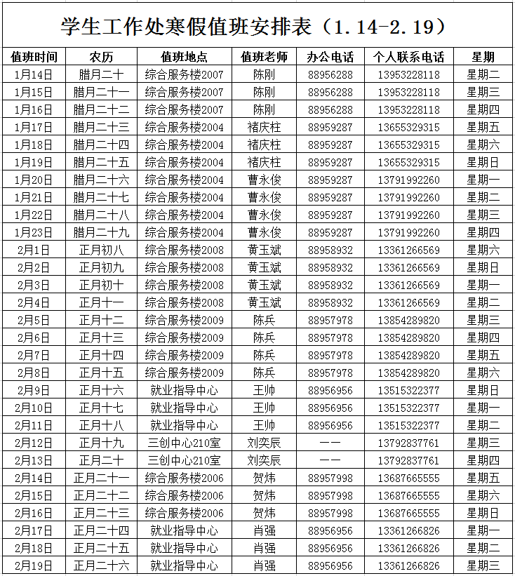 为方便广大师生在寒假期间处理各种业务,学生工作部(处)寒假安排值班如下: