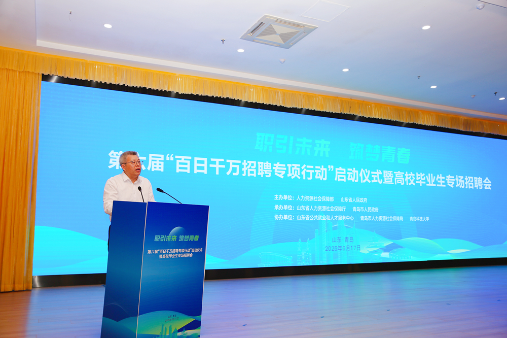 6月17日,由人力资源和社会保障部、山东省人民政府主办,山东省人力资源和社会保障厅、青岛市人民政府承办,山东省公共就业和人才服务中心、青岛市人力资源和社会保障局、伟德国际1949官网协办的第六届“百日千万招聘专项行动”启动仪式暨高校毕业生专场招聘会在伟德国际1949官网崂山校区举办。人力资源和社会保障部副部长颜清辉出席启动仪式并讲话。山东省人民政府副省长温暖致辞。人力资源和社会保障部就业促进司司长宋鑫主持仪式。启动仪式后,与会嘉宾到招聘会现场查看供需对接情况,了解企业用人需求及毕业生求职进展。