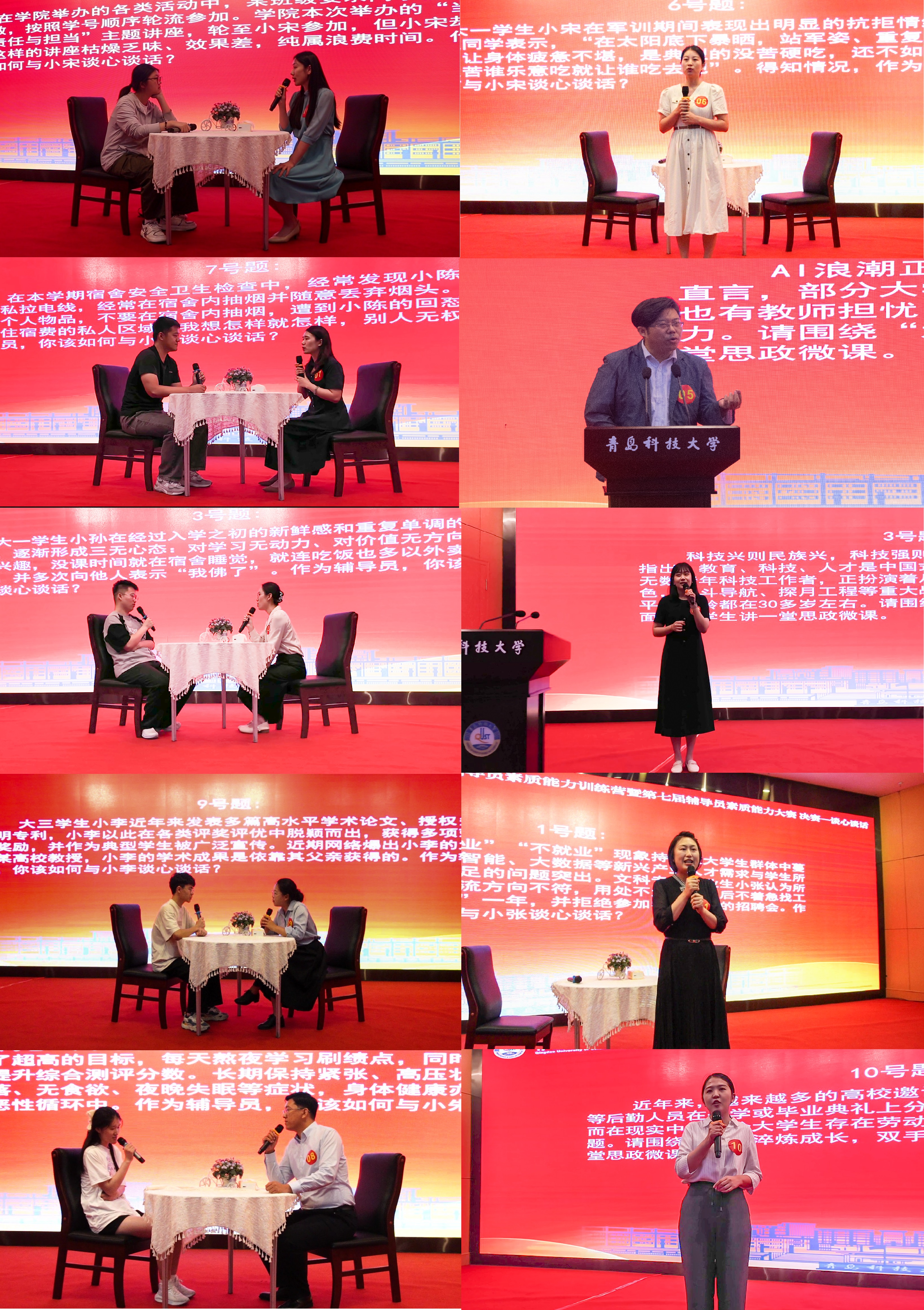 大赛决赛设置了谈心谈话、思政微课两个环节,重点考查辅导员的教育引导能力以及帮助、指导学生解决实际问题的能力。比赛中,参赛辅导员以扎实的理论功底和工作实践经验,全面展示了参赛辅导员的政治素养、业务能力和育人本领。