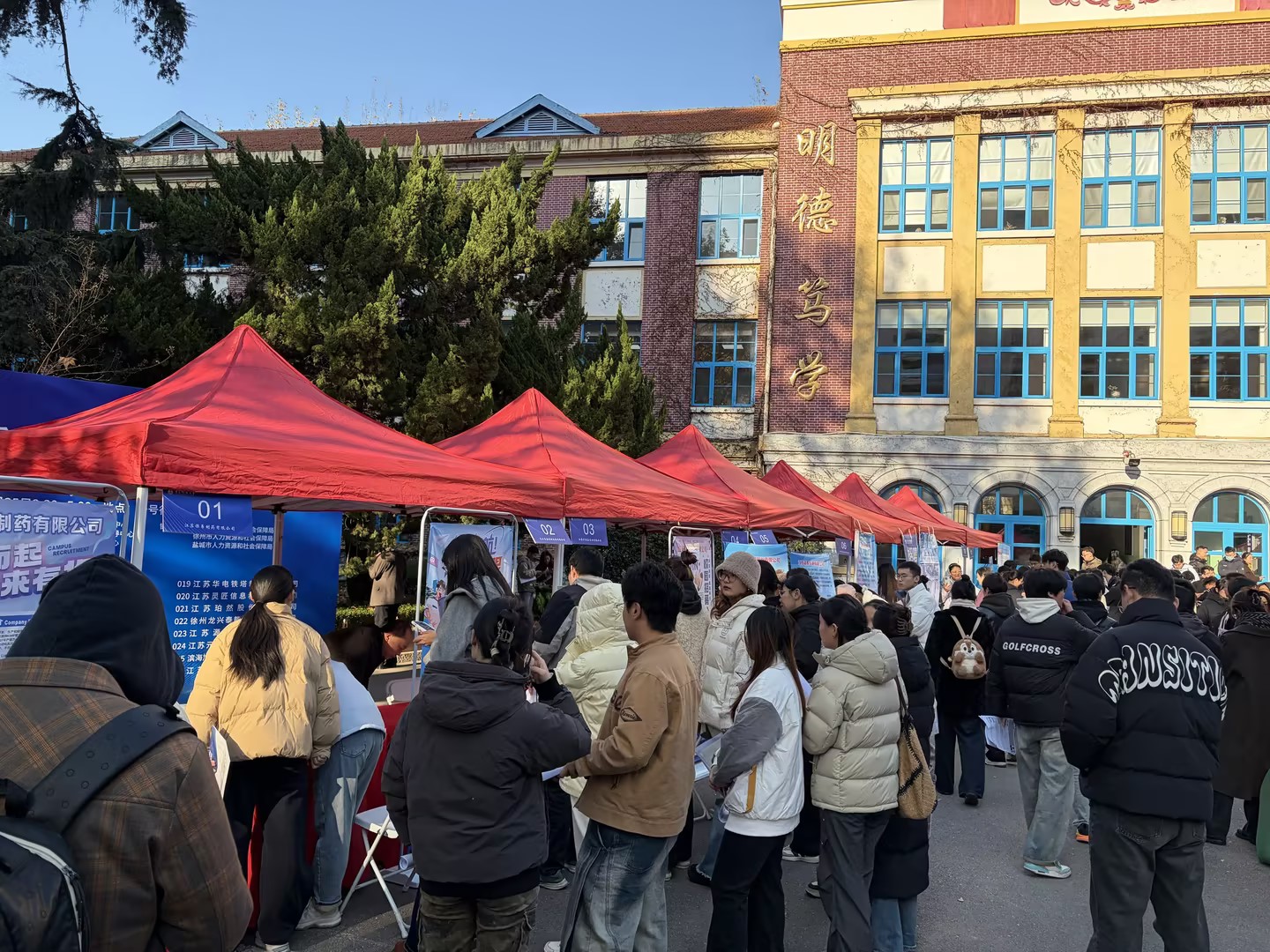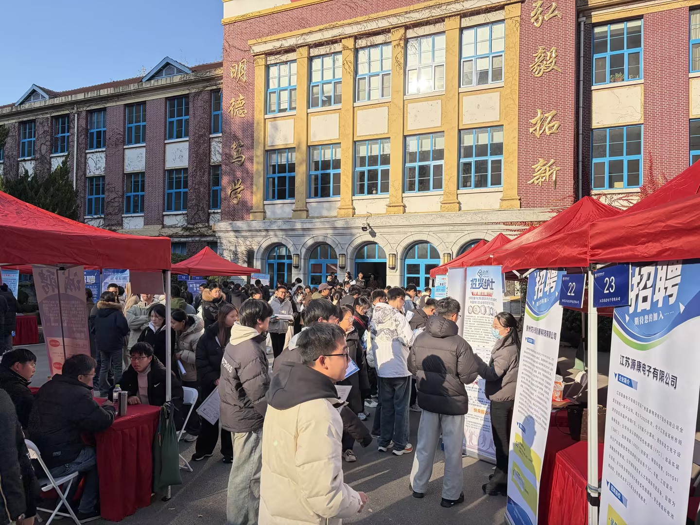 活动现场,学校行政楼前设置的一排排招聘展位吸引了众多2026届毕业生驻足咨询。招聘会上,连云港、徐州、盐城、南京地区的26家优质参会企业提供1400余个就业岗位,涵盖高端装备制造、新能源、生物医药、电子信息、人工智能等重点发展和优势产业领域。各用人单位耐心解答学生疑问,主动推介岗位需求,现场气氛热烈。