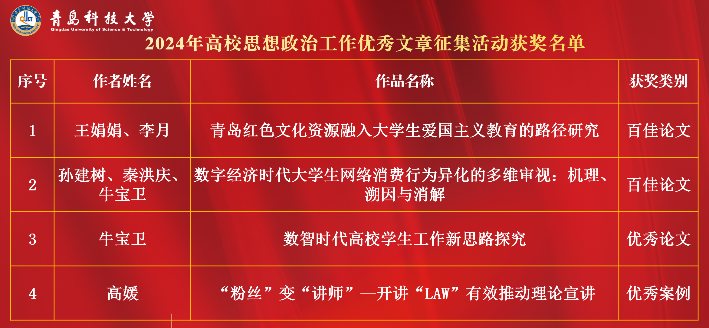 近日,教育部高校思想政治工作队伍培训研修中心(山东大学)、《高校辅导员》编辑部公布了2024年高校思想政治工作优秀文章征集活动评选结果。伟德官网辅导员报送作品斩获佳绩,荣获“百佳”论文2篇、优秀论文1篇、优秀案例1项。