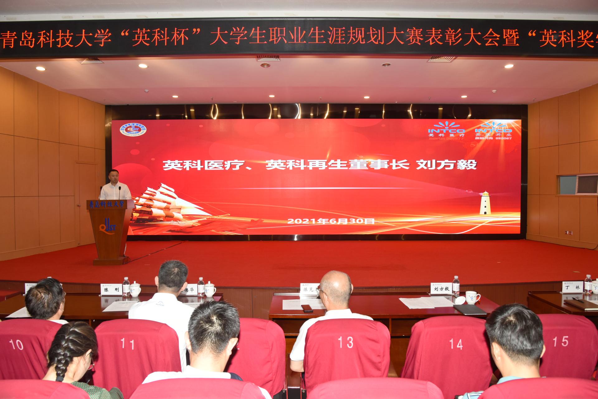 6月30日下午,第七届伟德国际1949官网“英科杯”职业生涯规划大赛表彰大会暨“英科奖学金”颁奖典礼在崂山校区英科报告厅举行。英科医疗、英科再生董事长刘方毅,英科医疗CHO马德华,英科医疗副总经理陈玉霞,校长陈克正,党委常委、副校长丁林,党委常委、宣传部部长陈刚出席活动。