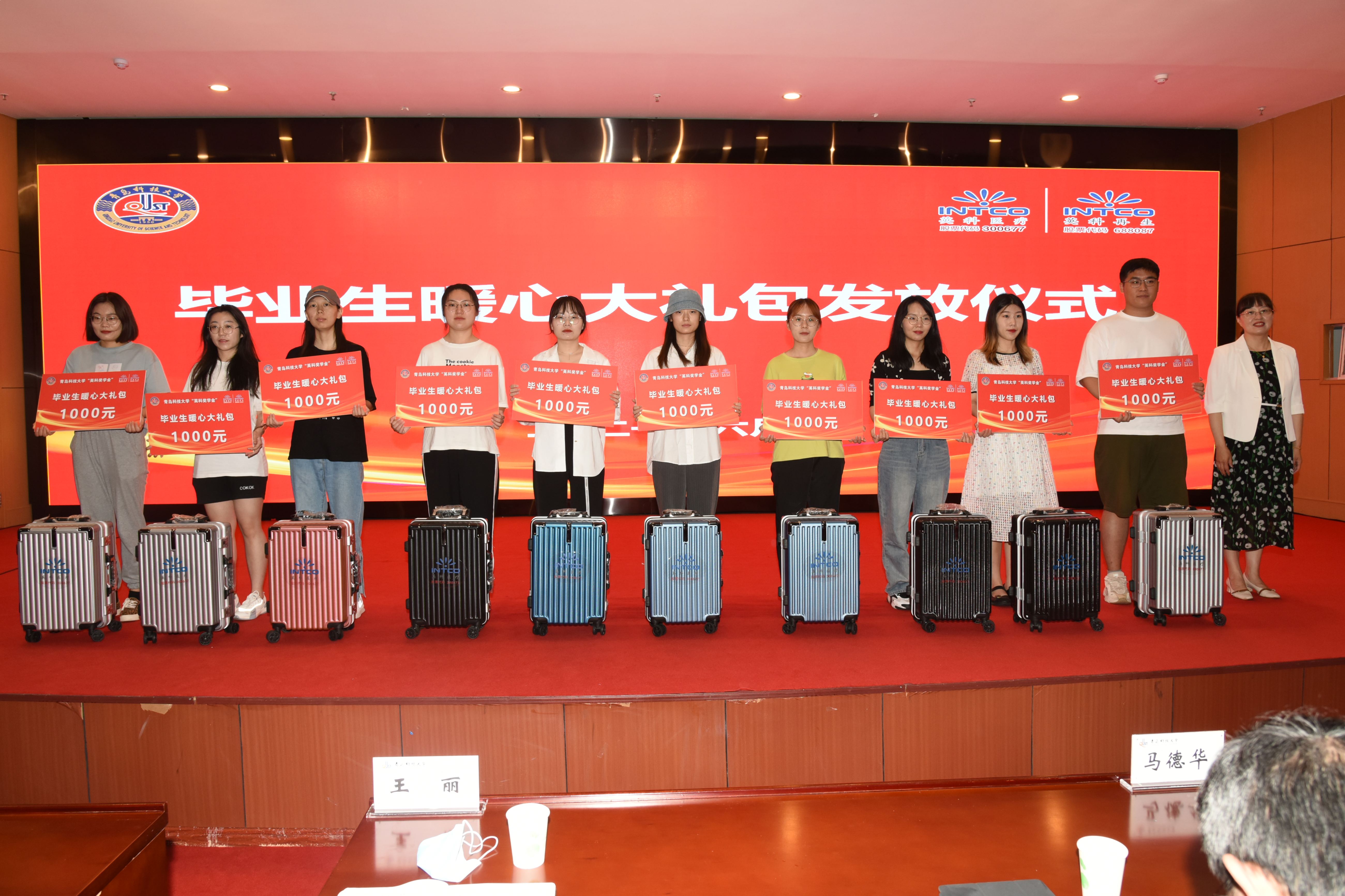 英科医疗与英科再生为48名签约英科的2021届毕业生发放了1000元现金和高端定制版行李箱,行李箱里面还放入了入职温馨提示、定制文化衫等温馨礼物,饱含学校和企业对学生的细致入微的关心和美好祝福。毕业生代表牛冰华发言,表达了对母校的眷恋和对英科的感激之情。