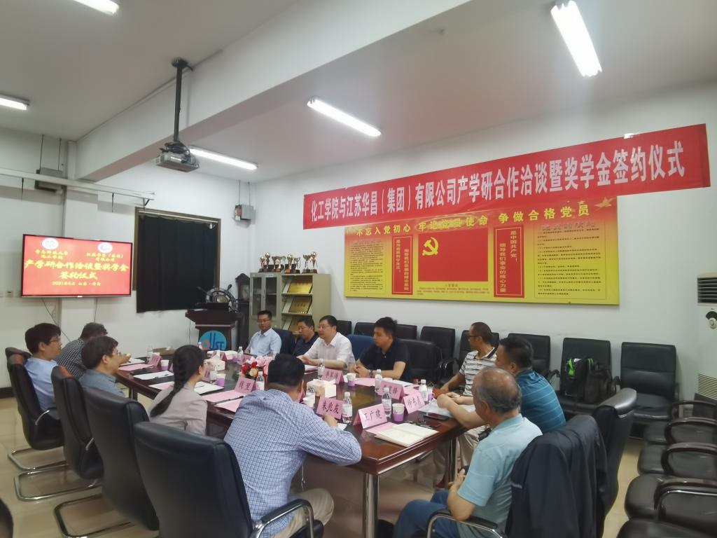 6月3日下午,化工学院与江苏华昌(集团)有限公司产学研合作洽谈暨奖学金签约仪式在学院2013会议室举行。江苏华昌(集团)有限公司党委书记、董事长胡波,党委委员、办公室主任楼新灿,团委书记李军海,江苏华昌化工股份有限公司副总经理李长胜、总经理助理李昊锋出席活动。学校教育发展基金会办公室主任王泽鹏,化工学院党政领导刘福胜、钱翌、孙明媚,专业教师吕志果、朱兆友、王广建、徐东彦以及各教研室青年教师代表参加。