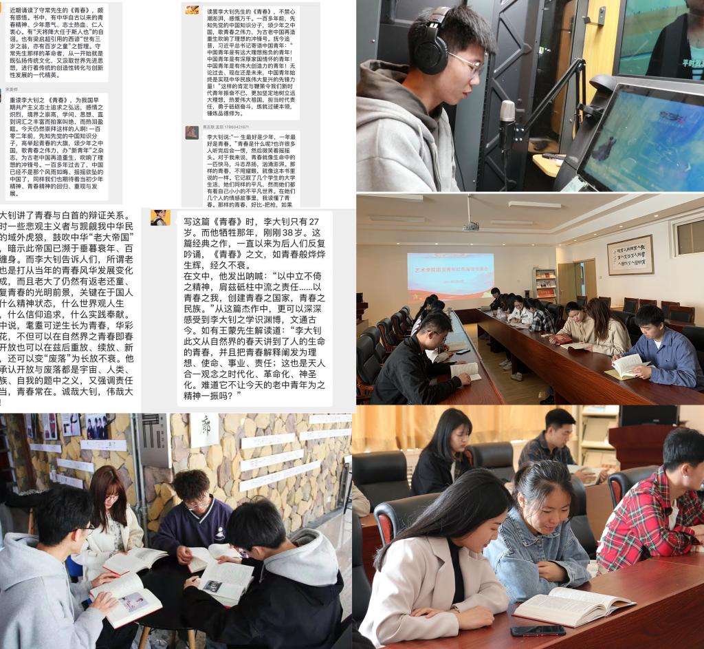 诵读红色经典,坚定理想信念。学院组织红色阅读交流会,鼓励青年学生走进朗读亭,诵读红色经典,感悟时代精神。以李大钊的《青春》一文,带领学院青年学生重温“为世界进文明,为人类造幸福”的青春誓言,号召全院团员青年肩负起时代赋予的责任,秉持青春向党的坚定信念,以新时代新青年的朝气和活力卯力前行。