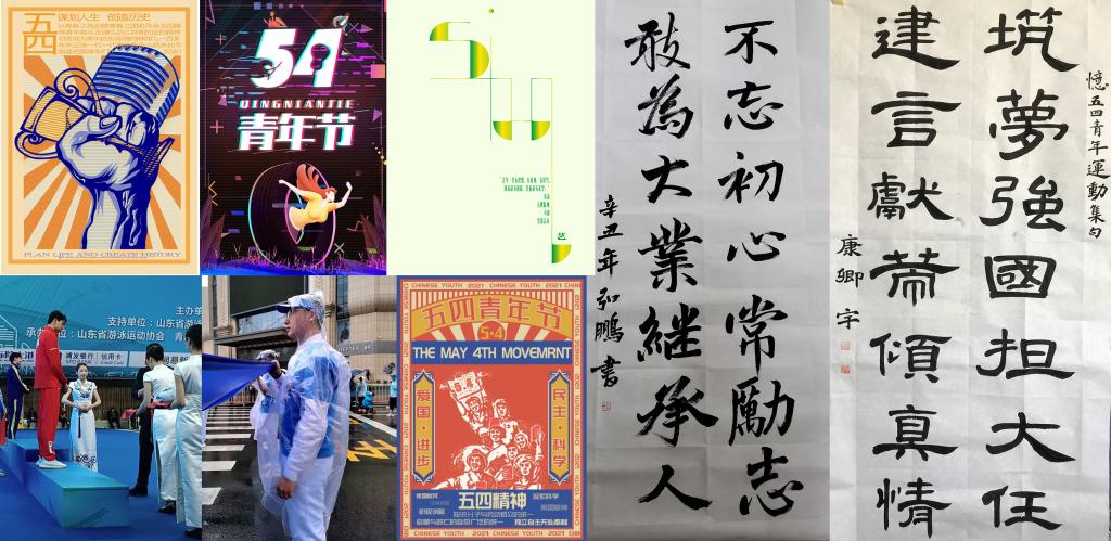 践行青春力量,致敬五四精神。学院团员青年充分发挥专业主动性,以艺术作品为载体,创作书法、设计、绘画等原创作品致敬五四青春。以社会实践为平台,在全国游泳冠军赛暨东京奥运会选拔赛和青岛马拉松比赛中积极参加志愿服务,用自己的方式纪念五四运动。学院团员骨干宋美桦同学坚定地说,“这是青春的节日,更是奋进的时代。今年的五四青年节在建党100周年的时代背景下,格外鲜明,意义非凡。作为时代的弄潮儿,我们深知自己是幸运的一代,也是责任重大的一代,我们一定要练就过硬的本领,掌握丰富的知识,始终保持与时代同步的专业文化,努力成为德艺双馨、全面发展的新时代青年。”