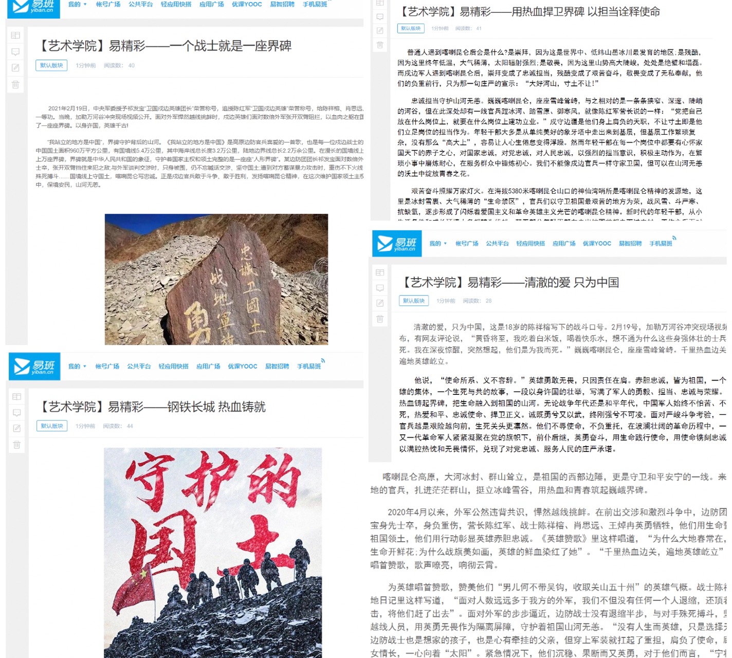 围绕学习“卫国戍边”英雄,讲好青年担当。学院依托微信公众号、易班等线上平台召开“学英雄官兵精神,作‘六有’时代青年”心得感悟征稿,将新时代卫国戍边英雄战士对党绝对忠诚、矢志强军报国、扎根高原、常备不懈、枕戈待旦、誓死捍卫祖国领土的战斗精神刻画艺院学子心中。