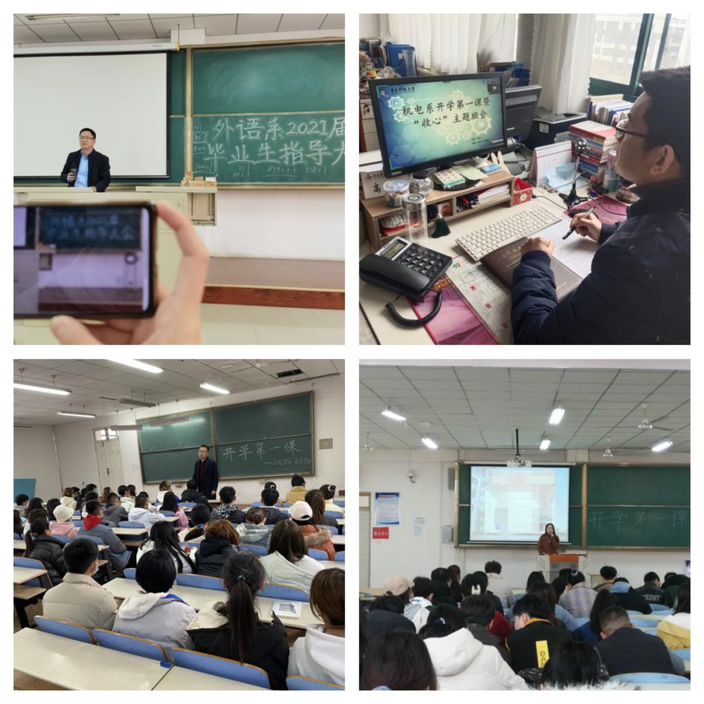 外语系邀请系主任、专业课教师围绕疫情防控、安全教育、爱国主义教育、挑战杯备赛、就业等开展系列教育活动。经管系通过戍边英雄事迹等,与同学们共话爱国主义对毕业生进行了相关指导。高材系根据不同年级开展相应的教育并深入课堂听课艺术系从疫情防控、宿舍建设、学风建设、专升本和就业情况等方面开展教育。计算机系围绕加强“四史”学习、安全主题教育等主题开展了系列线上开学第一课教育活动。机电系从常态化疫情防控教育、党史学习教育、就业等方面开展了教育。自动化系思想政治引领等多方面上好学生开学第一课,并带领同学们集中观看了《战疫一线党旗红》。化工系从多方面多角度普及疫情防控和公共卫生知识,加强学生的思想价值引领。