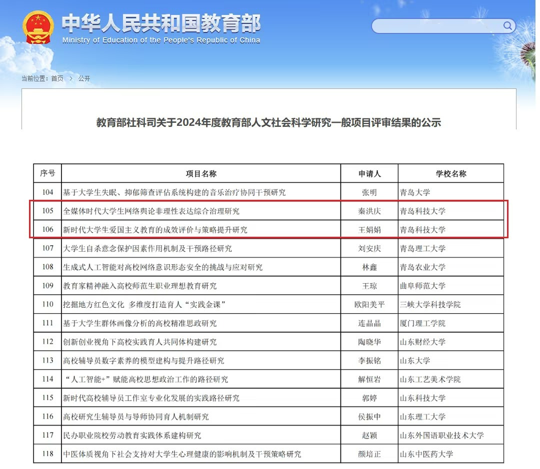 近日,教育部社会科学司公示了2024年度教育部人文社会科学研究专项任务项目(高校辅导员研究)的评审结果,学校秦洪庆主持的《全媒体时代大学生网络舆论非理性表达综合治理研究》和王娟娟主持的《新时代大学生爱国主义教育的成效评价与策略提升研究》获批立项,立项数量创历年新高。