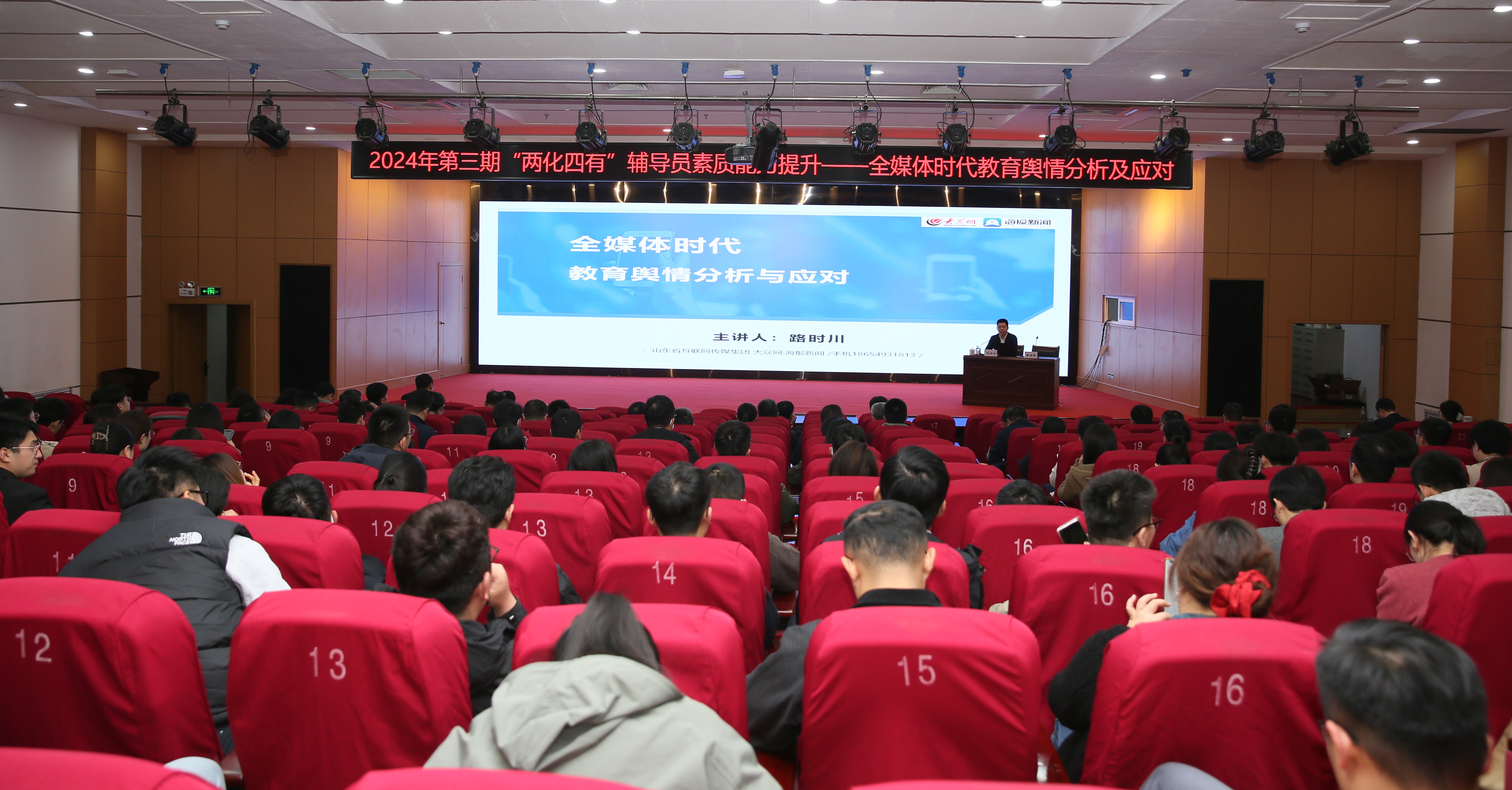 11月6日下午,党委学生工作部联合党委宣传部在崂山校区英科(第三)报告厅开展“两化四有”辅导员素质能力提升培训,山东省互联网传媒集团大众网·海报新闻教育频道主任路时川应邀做专题培训。党委常委、宣传部部长张洪坤主持培训会。
