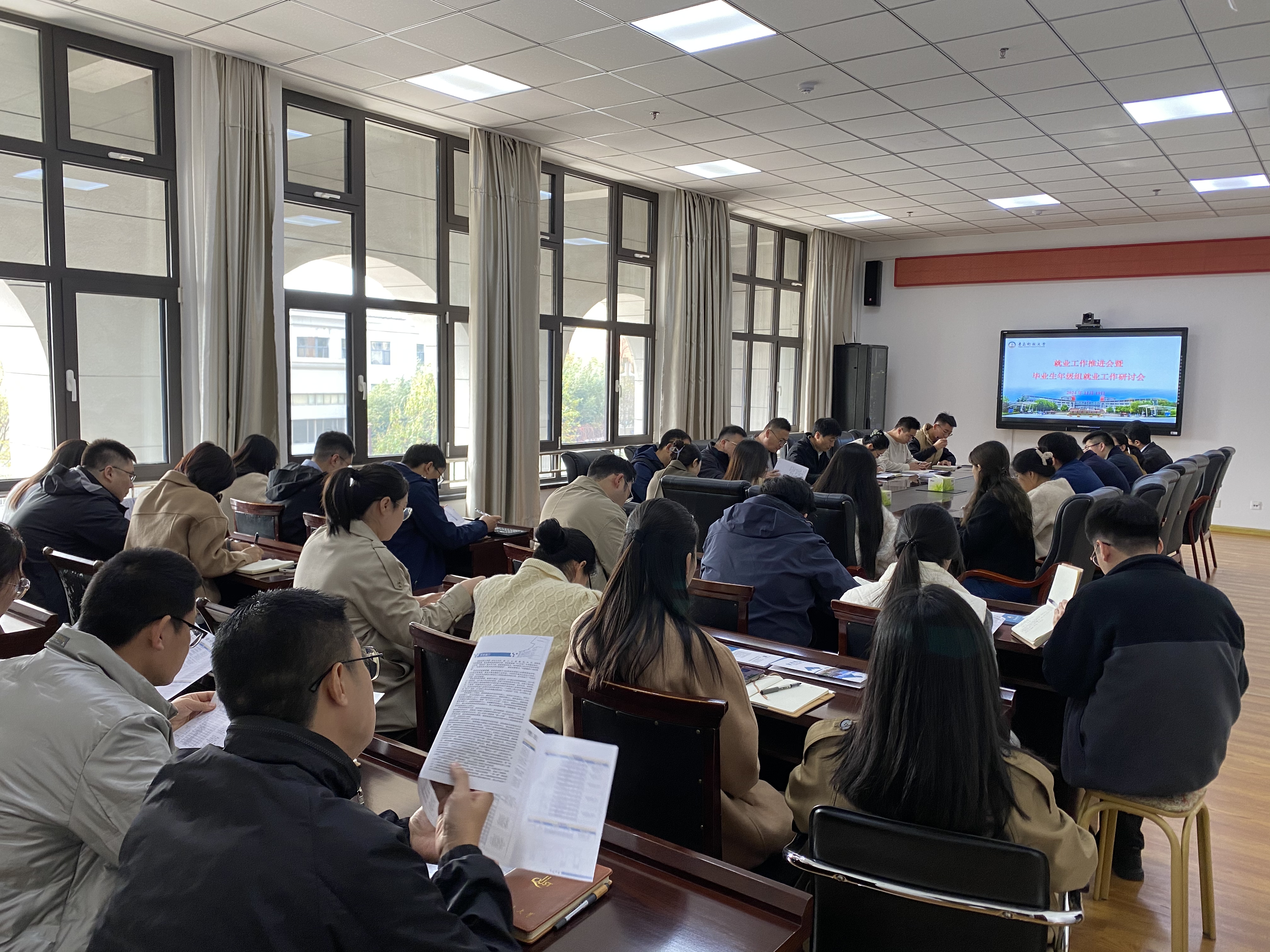 为进一步做好2025届毕业生就业工作,抢抓秋季学期促就业关键期,结合当前2025届毕业生就业工作开展情况,11月19日上午,学校2025届毕业生就业工作推进会暨本科毕业年级工作组就业工作研讨会在崂山校区综合楼2015会议室举行。学生处副处长兼就业指导中心主任徐华、就业指导中心相关人员、全体毕业生年级辅导员参加会议。