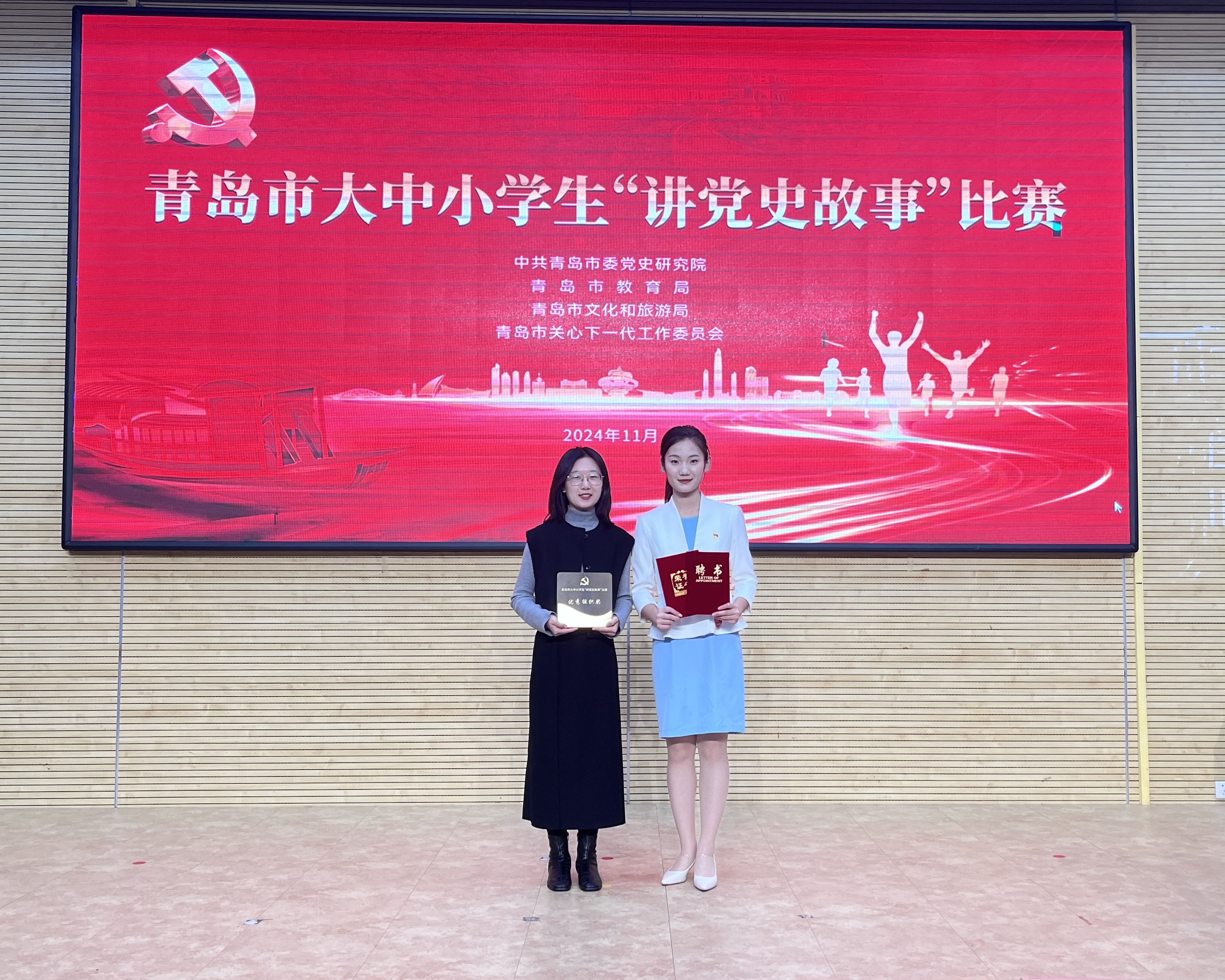 近日,青岛市大中小学生“讲党史故事”比赛决赛在青岛第二实验初级中学举行。本次活动由青岛市委党史研究院、市教育局、市文化和旅游局、市关心下一代工作委员会主办,青岛党史纪念馆承办,学校荣获优秀组织奖,法学院社工221班李玉喆荣获二等奖,获聘“青岛市党史故事宣讲员”。