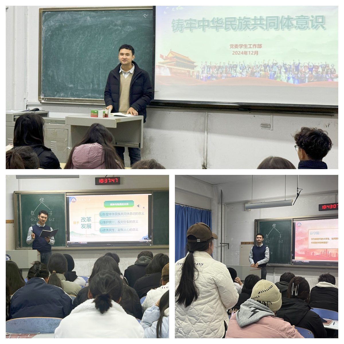 班会上,大家围绕“作为新时代的大学生,如何积极投身中华民族共同体建设?”展开讨论。同学们一致认为,作为新时代的大学生,要时刻铭记党的恩情,牢固树立法治意识,坚定理想信念,自觉维护民族团结,争做民族团结的践行者和传播者。