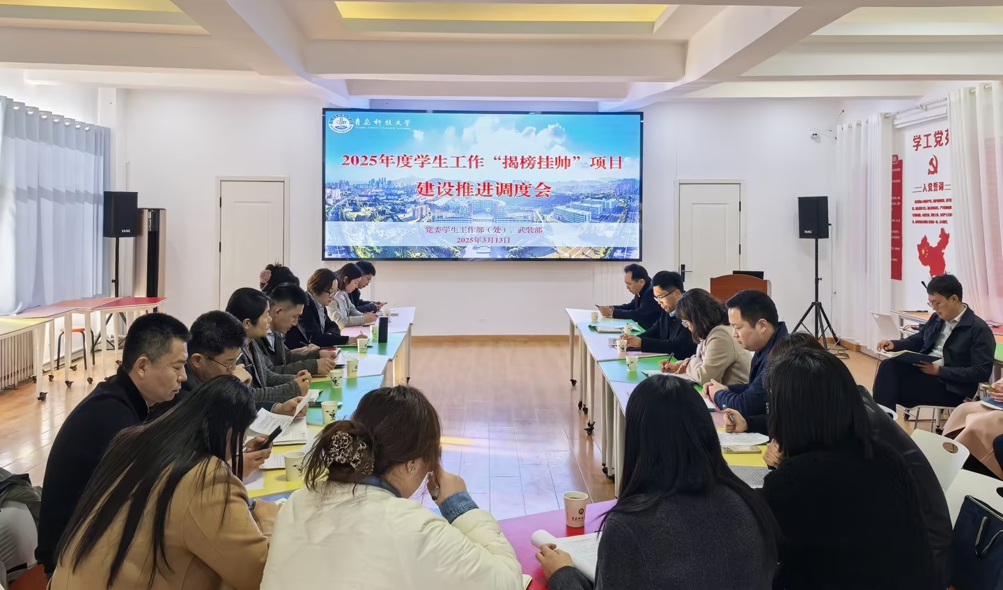 3月13日,学校2025年度学生工作“揭榜挂帅”项目建设推进调度会在崂山校区召开。党委学生工作部部长王丽出席会议并讲话。党委学生工作部相关负责同志及科室、中心负责人,各项目组主持人参加会议。