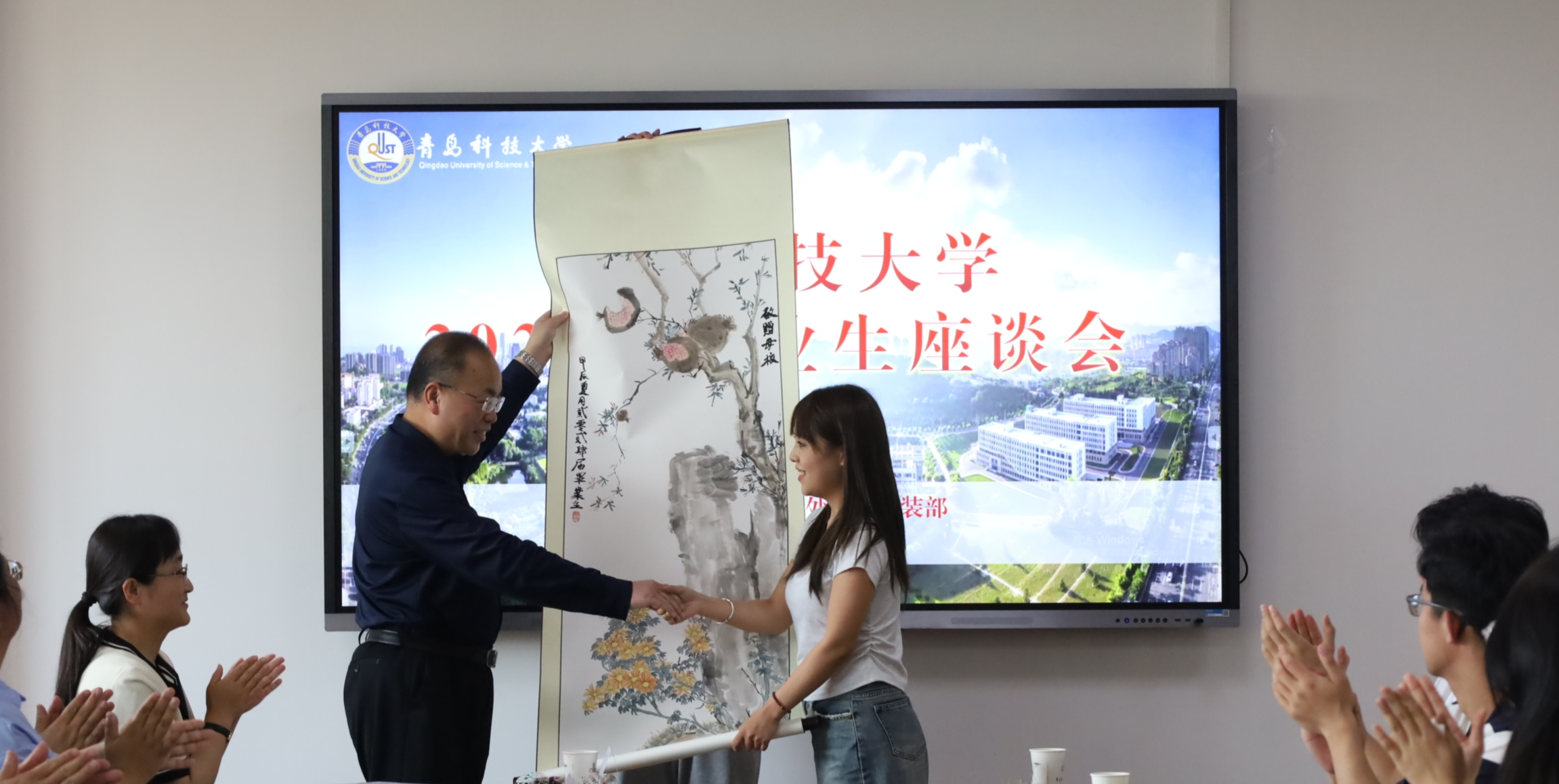 座谈会上,来自各学院、校区的21名毕业生代表深情回顾了在青科大校园的美好时光,分享交流了在校期间的成长与收获,深切表达了对母校、恩师、同窗的感激、不舍与祝福。同时还就学校发展、教学科研、就业创业和后勤保障等积极建言献策。丁林代表学校向毕业生代表赠送青科文创纪念品,2024届毕业生代表向学校赠送《石菊风华》绘画作品。