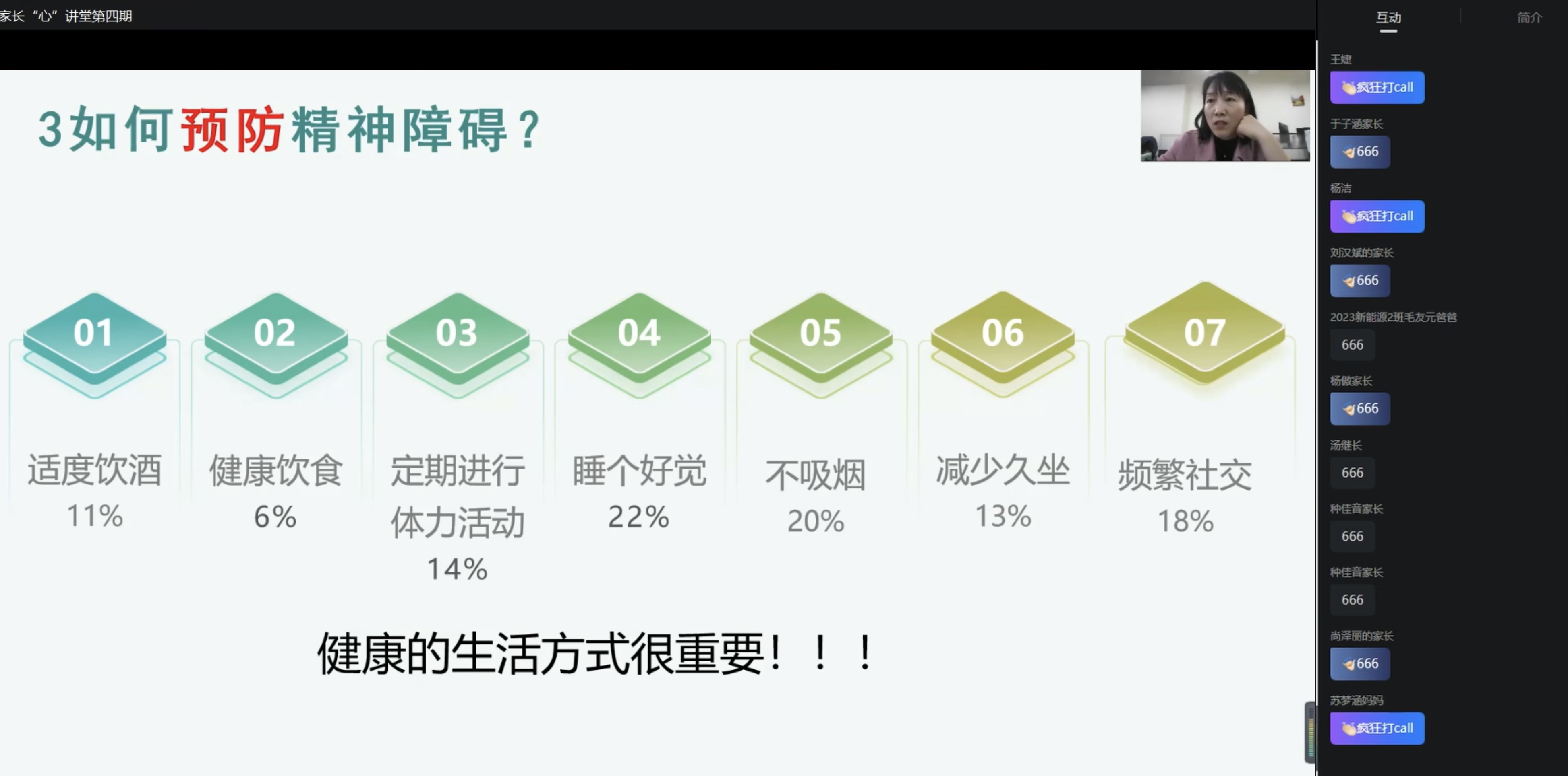 李海玲以人格发展理论为切入点,解读大学生的心理发展任务,介绍常见的精神障碍特点,从“是什么”层面帮助家长了解大学生心理危机的产生机制。并且,以助力学生心理成长为落脚点,提出共情式倾听、建设性争吵、家校协同联动的心理危机帮扶策略,从“如何做”层面引导家长关怀支持心理危机学生。在讲座中,李海玲以实际工作案例为辅助,极具教育指导意义的方法获得满屏的好评和点赞。
