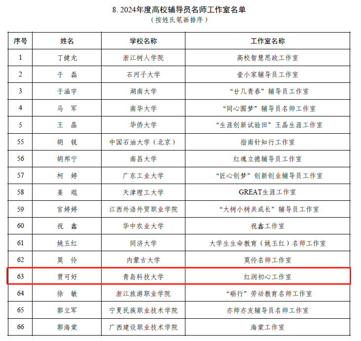 近日,教育部办公厅印发《关于公布2024年度高校思想政治工作质量提升综合改革与精品建设项目入选名单的通知》,全国首批立项建设高校辅导员名师工作室80个,其中驻鲁高校4个,伟德官网贾可好老师主持的红润初心工作室成功入选。