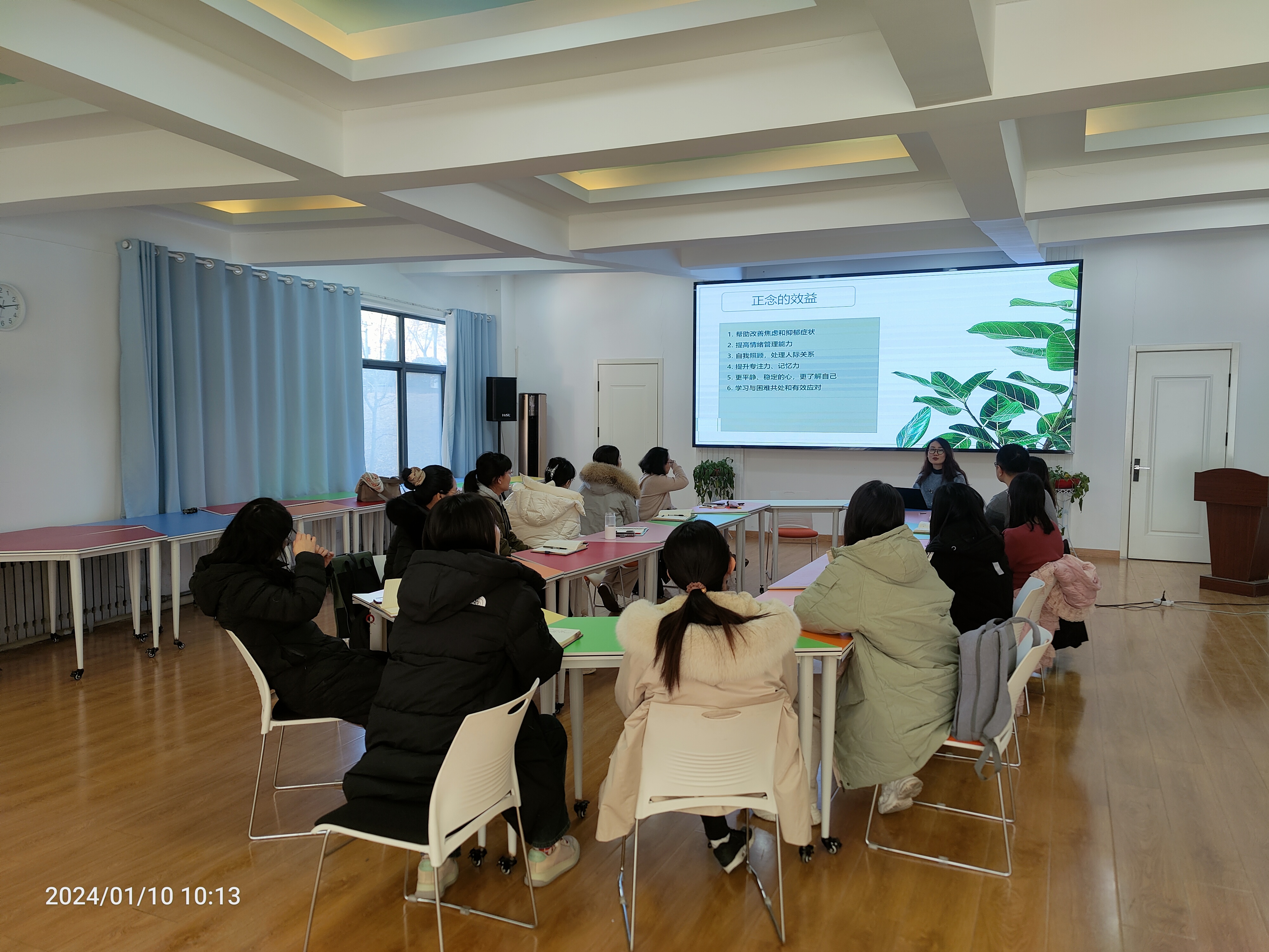 讲座中,老师们认真倾听、积极体验,在相互分享和体验式练习中提升对身心感受的觉察能力以及对压力的耐受度在日后的工作和生活中能够更好地智慧助人、关照自我。