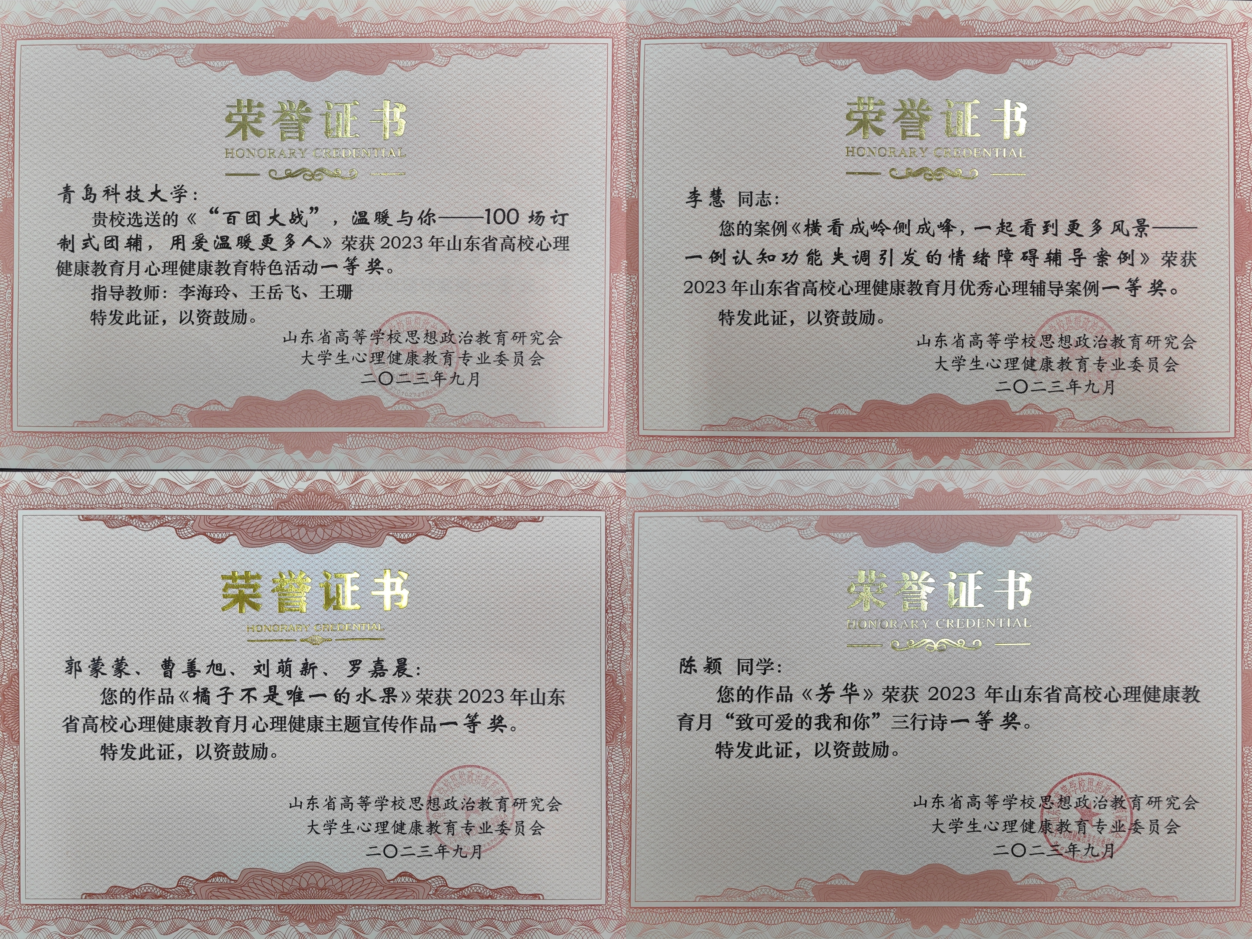 近日,山东省高等学校思想政治教育研究会、大学生心理健康教育专业委员会公布了2023年山东省高校心理健康教育月评选展示活动结果。经过专家评审,伟德官网获一等奖4项、二等奖1项和三等奖1项,获奖质量再创新高。李海玲、王岳飞、王珊指导的特色活动《“百团大战”,温暖与你——100场订制式团辅,用爱温暖更多人》荣获一等奖;李慧撰写的《横看成岭侧成峰,一起看到更多风景——一例认知功能失调引发的情绪障碍辅导案例》和王珊的《“抱歉,我只能陪你走到这里了”——一例遭遇严重家庭创伤个案的辅导案例》分别荣获优秀心理辅导案例一等奖和二等奖;郭蒙蒙指导的学生作品《橘子不是唯一的水果》荣获宣传作品类一等奖;经管学院学生陈颖的《芳华》和材料学院学生左义勇的《致可爱的我和你》 分别获得三行诗评选类一等奖和三等奖。