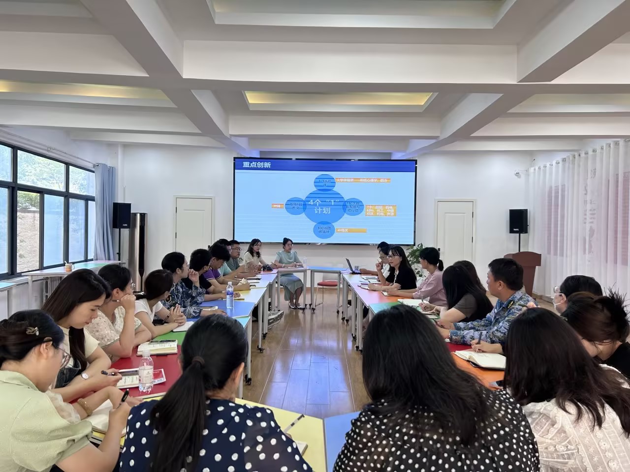 王岳飞介绍了本学期心理健康素质测评及后续访谈排查工作的内容与安排,王珊就心理素质一体化平台中的危机干预模块进行了培训。最后,与会老师就新学期心理工作的开展、危机上报等具体事宜进行了深入交流。