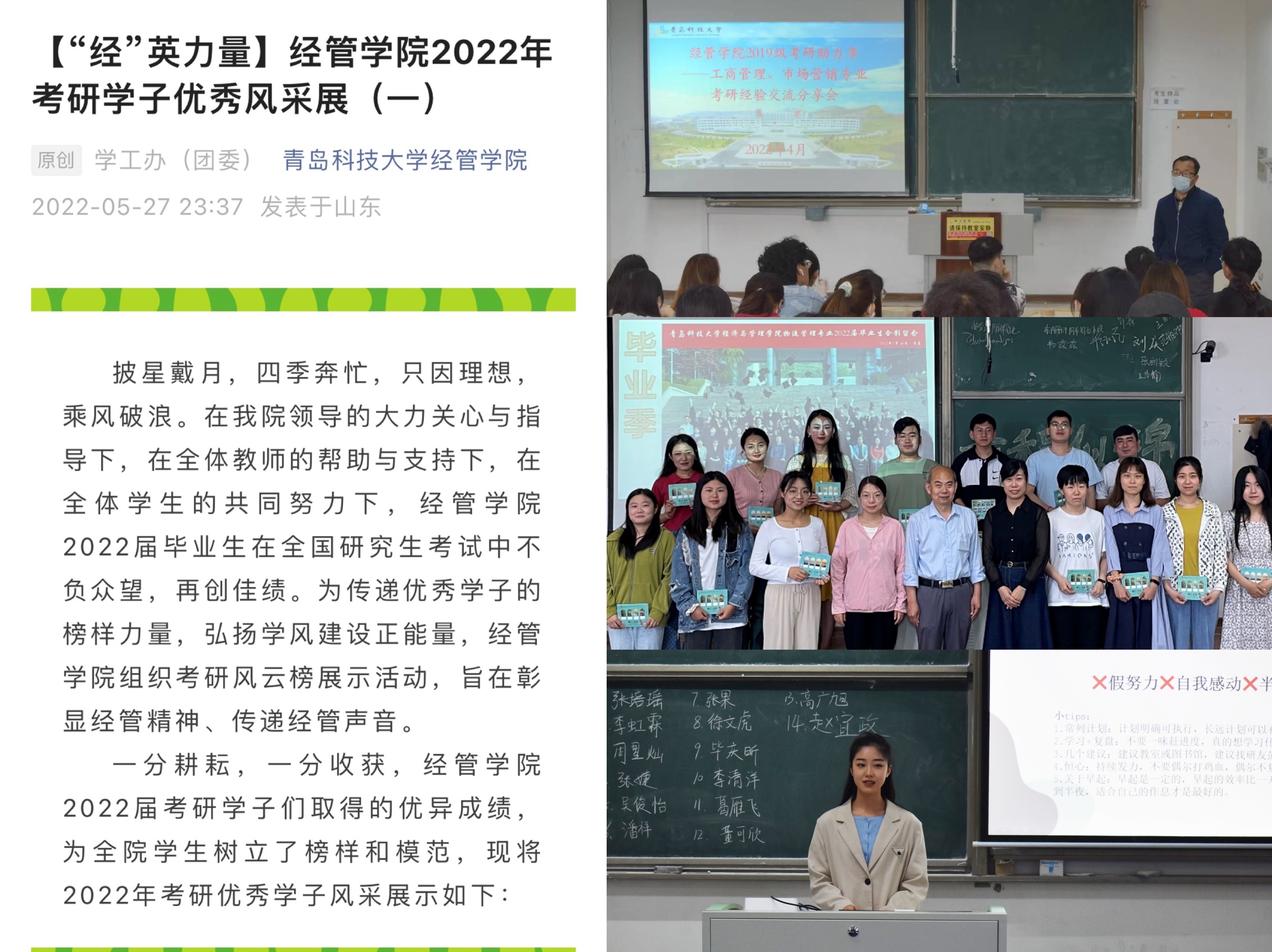 在经管学院,有着一群优秀的青年,他们用努力奋斗的舵,驶向最美青春模样的航,谱写精彩科大四年时光,学院通过官方微信公众号对2022届优秀毕业生进行巡展活动,挖掘展示各方面有突出成绩和影响力的学生典型事迹,充分发挥典型示范作用。在全体学生中营造乐学好学、敬业奉献、向上向善的风气。