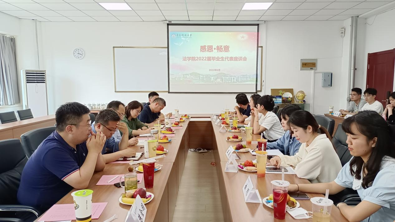 【心怀感恩,共话成长】为上好2022届毕业生“最后一堂思政课”,助推学院高质量发展,6月17日下午,法学院在弘毅楼c区307会议室召开2022届毕业生代表座谈会。毕业生代表们分享了校园生活的难忘回忆,交流了在校期间的学习成果、收获感悟,谈到了对未来工作、生活的期待,表达了对老师们的感谢以及对母校的眷恋之情,并对学院未来发展提出了自己的意见建议。学院领导老师认真听取了同学们的发言,结合自身的求学、求职、初入职场等经历和感受,为学生梳理思路、加油打气,并希望同学们在工作中长才干、练本领,做无愧于时代、无愧于人民、无愧于历史的时代新人。