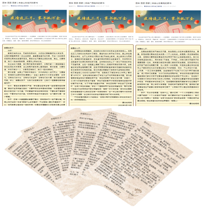学院加强家校联动,第一时间通过官方网站、微信公众号、微信群、QQ群等渠道发布实时动态,反映学生在校学习生活和志愿服务情况,让家长得以随时获取最新消息。学院鼓励学生多与父母进行沟通,分享自己的校园生活和学习情况,号召老师与家长进行电话或视频交流。学院开展“百年 百团 百家”家书接力活动,家长们纷纷通过线上书信方式表达了对学校的感谢、对老师的感恩、对孩子的鼓励。家校共育,同心战疫,携手为学生营造了健康、安全、有序的生活和学习环境。