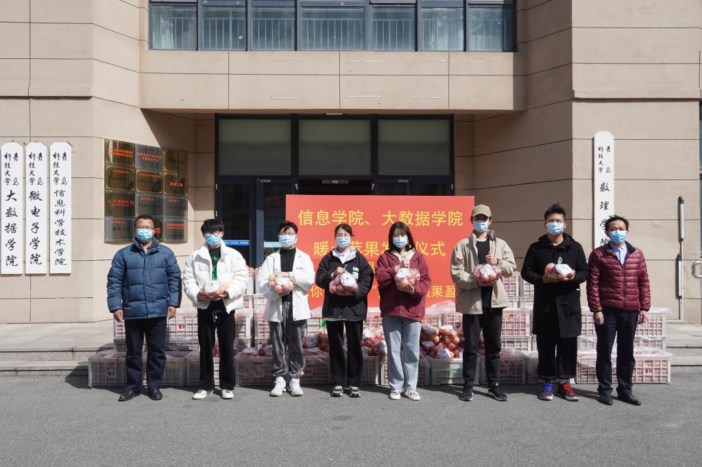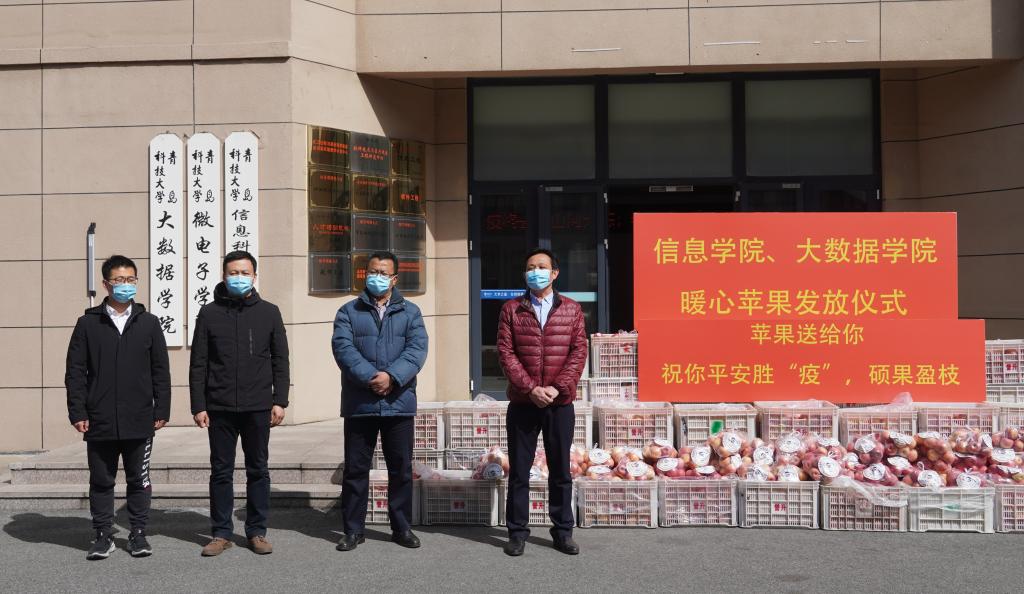 校园里春意盎然。3月26日上午,信息学院、大数据学院在学院楼下举行苹果发放仪式。为全体在校生发放5000余个苹果,“苹果送给你,愿你平安胜‘疫’,硕果盈枝”。学院院长刘国柱、学院党委书记刘庆、学院党委副书记兼副院长王军出席此次仪式。