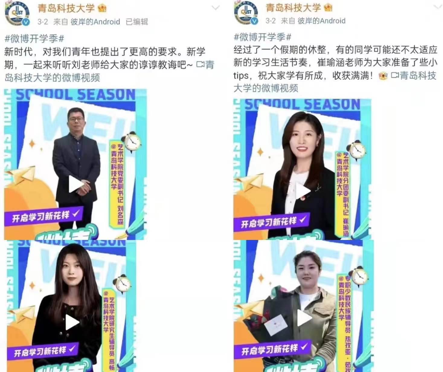 学院通过生涯工作室录制“开学季辅导员、班主任有话说”,目前在学校官方微博账户发布5篇。辅导员围绕如何缓解学生开学焦虑、学生的开学寄语、开学注意事项及疫情期间如何做好防护等方面的内容展开。新颖的沟通宣传方式,有效解决学生的实际问题,赢得了学生的喜爱。