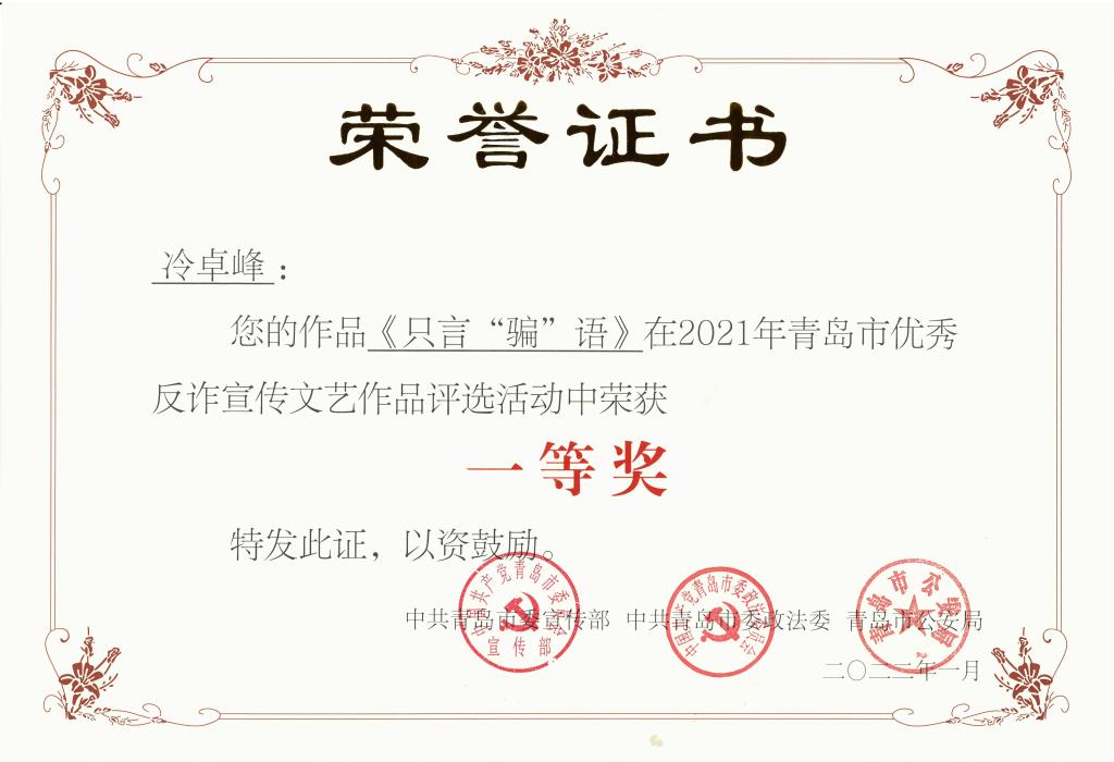 日前,2021年青岛市优秀反诈宣传文艺作品征集评选活动结果揭晓。伟德官网传媒学院冷卓峰同学的作品《只言“骗”语》荣获一等奖,学校荣获“优秀组织奖”。