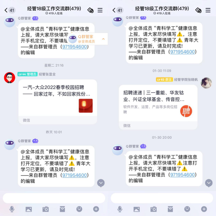 假期前,结合学校疫情防控政策和学校通知要求,经管学院学工办召开“第十二期学工半月谈”会议,专题研究假期重点工作,根据年级侧重点布置工作事宜,确保辅导员与学生“离校不离线”。各年级依托年级大会、专业会议,及时召开寒假工作部署会,部署安全稳定、学业提升、考研就业、社会实践、科创竞赛等工作,并重点强调疫情防护、交通出行、电信诈骗等各类安全问题,引导学生知悉寒假“可为”与“要为”,把握假期时间突破自我发展困境,积极进行自我充电。